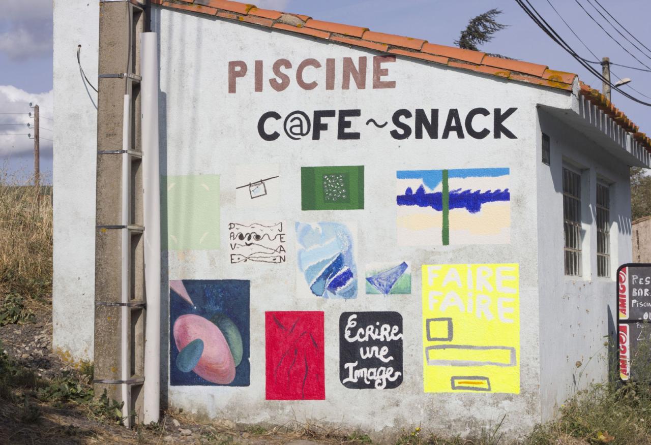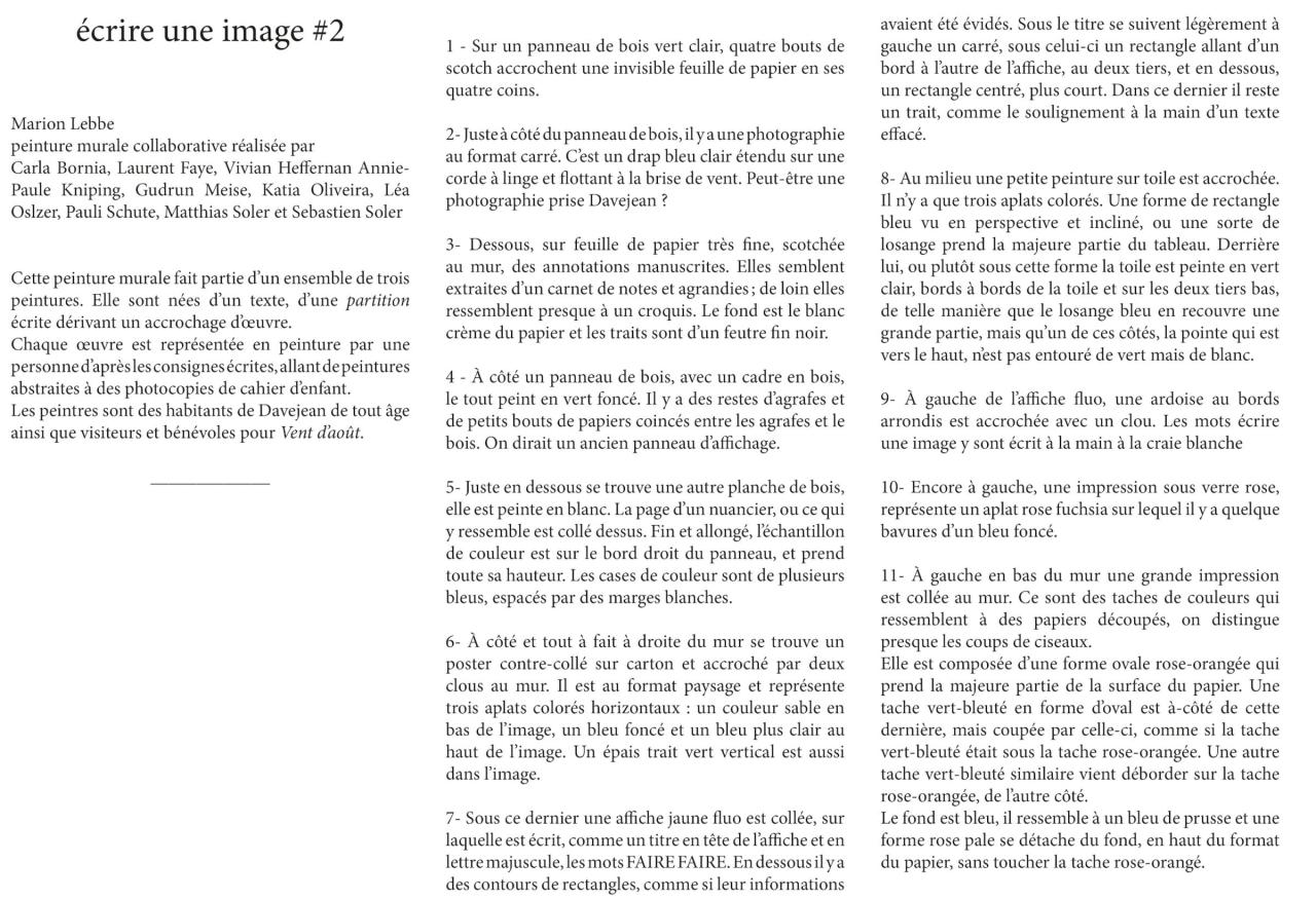 Marion Lebbe, Écrire une image, 2018, peinture murale collaborative réalisée d’après une partition, un texte décrivant un accrochage d’œuvres, dans le cadre de la résidence à Davejan, Aude, pour le festival de rencontres artistiques Vent d’août.