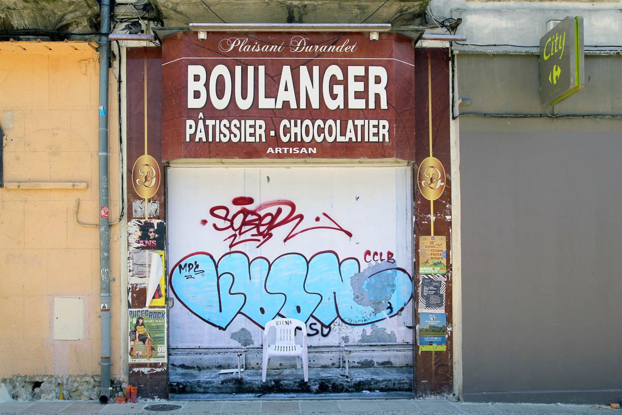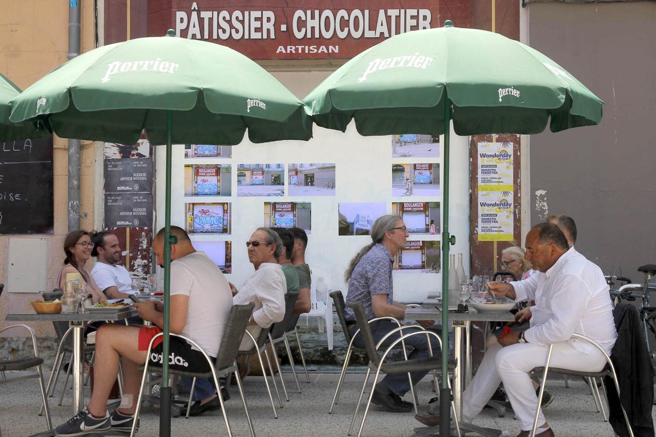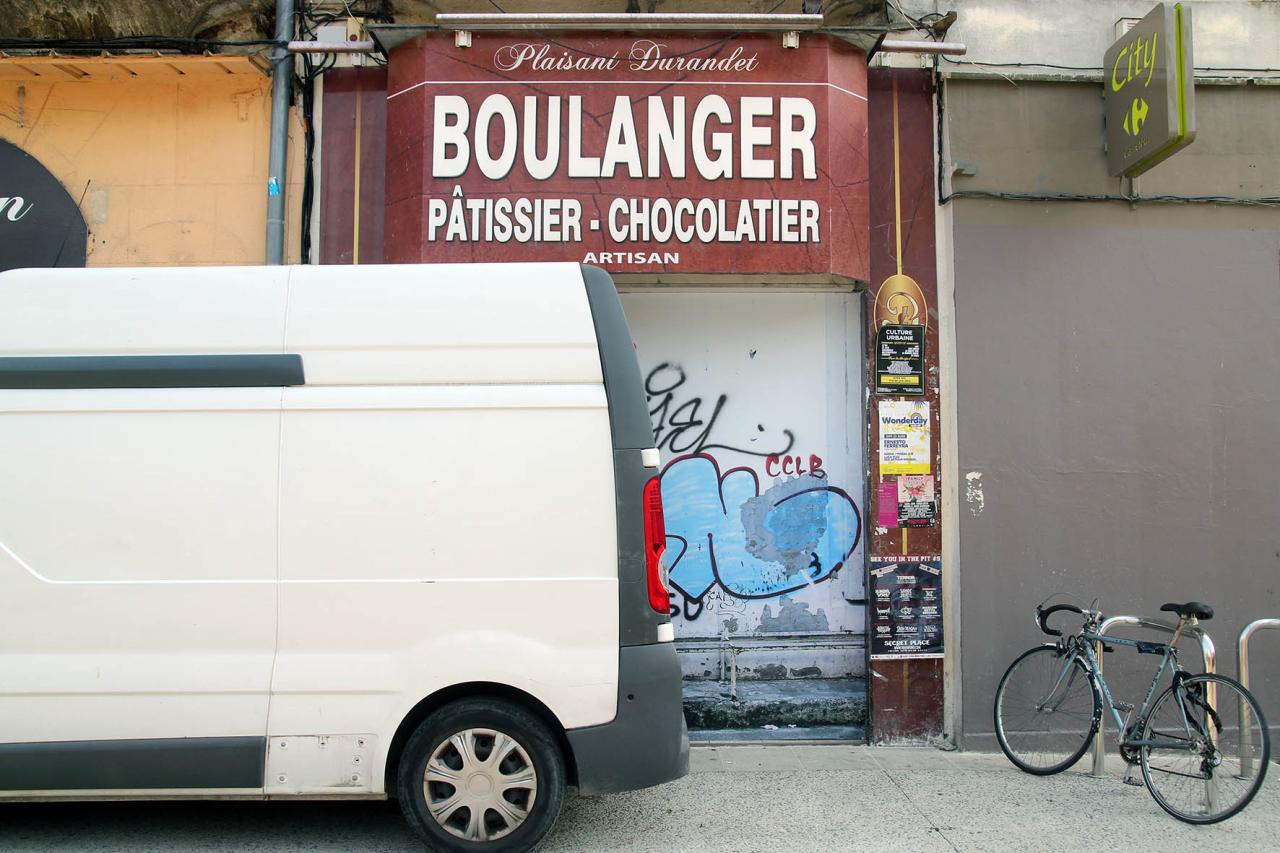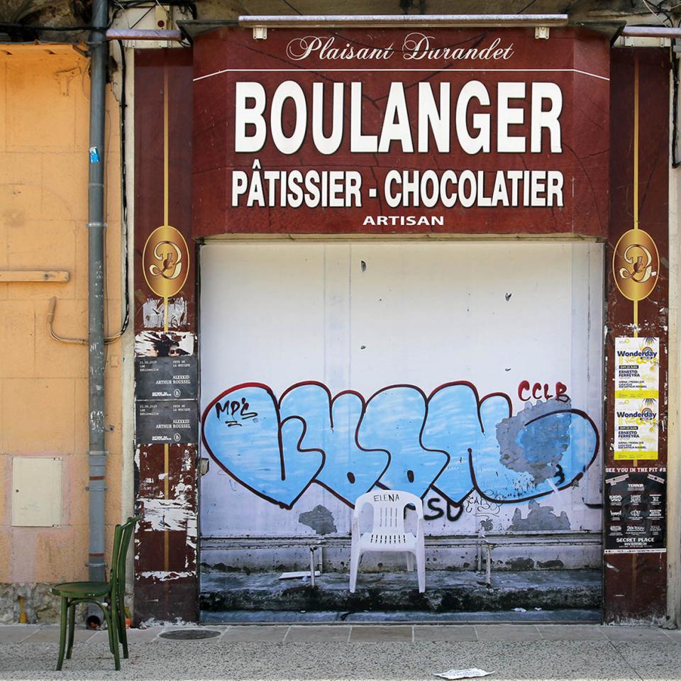 Une enseigne abandonnée, des affiches collées et décollées, le menu du jour et sa terrasse extensible, l’occupation précaire de l’entrée du Carrefour, un chantier toujours en cours et d’autres éléments composent l’environnement dans lequel est posée une image rapportée.