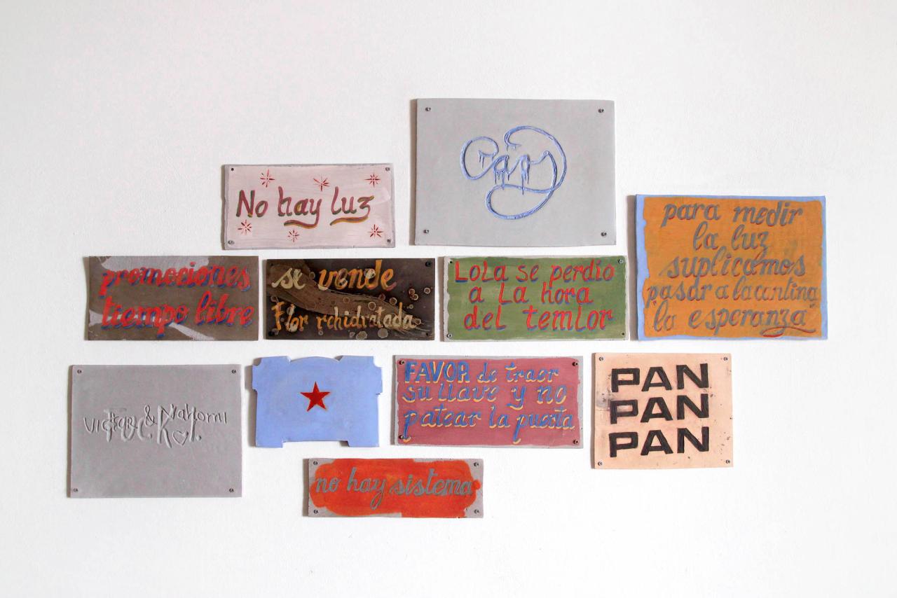 Ces « exercices de peinture » à l’engobe ou à l’émail sur plaques de terre cuite sont inspirés de la pratique toujours vivante des rotulistas, les peintres en lettre traditionnels mexicains, et sont réalisés à partir d’une collecte de letreros (petites annonces ou messages informatifs laissés dans les rues de Mexico).