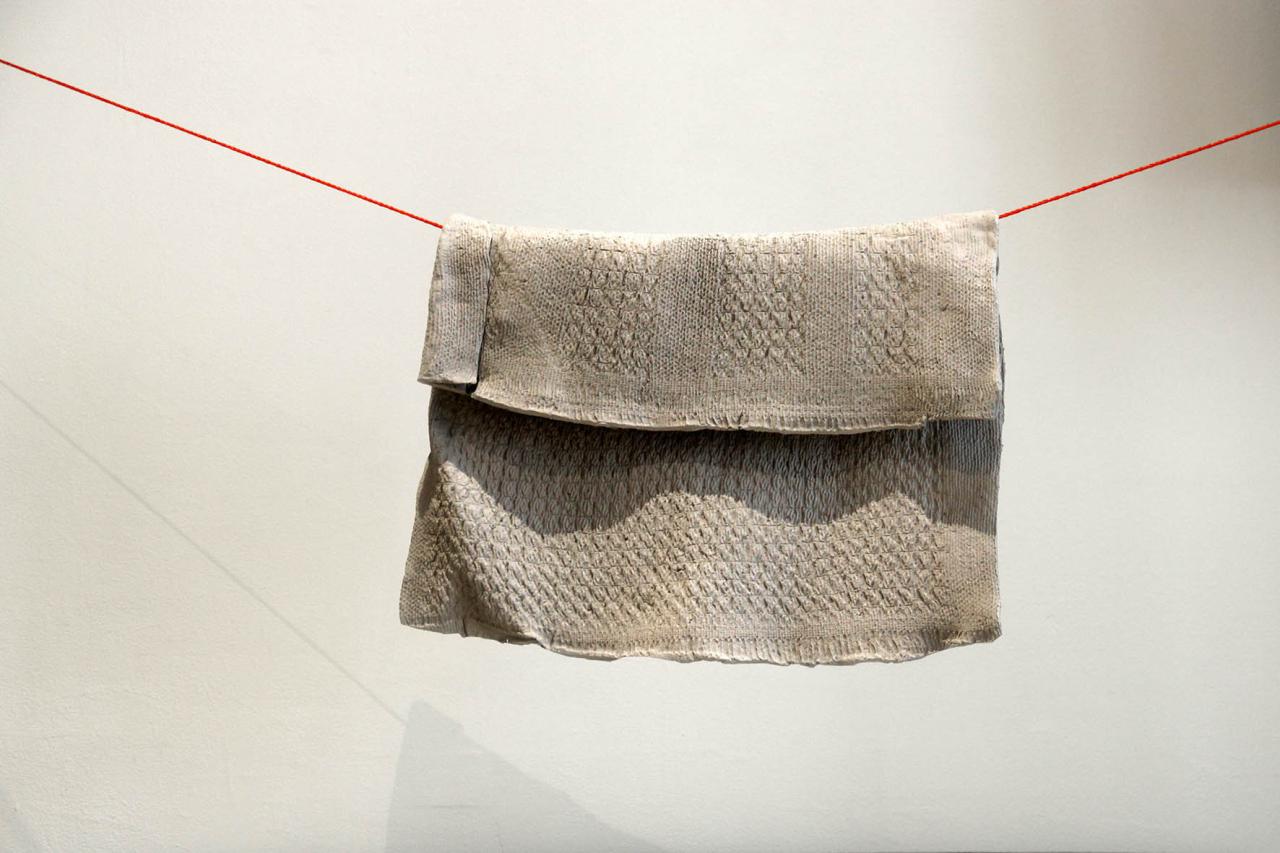 Serpillière étendue, 2021, faïence grise et ficelle, 43 x 32 x 5 cm