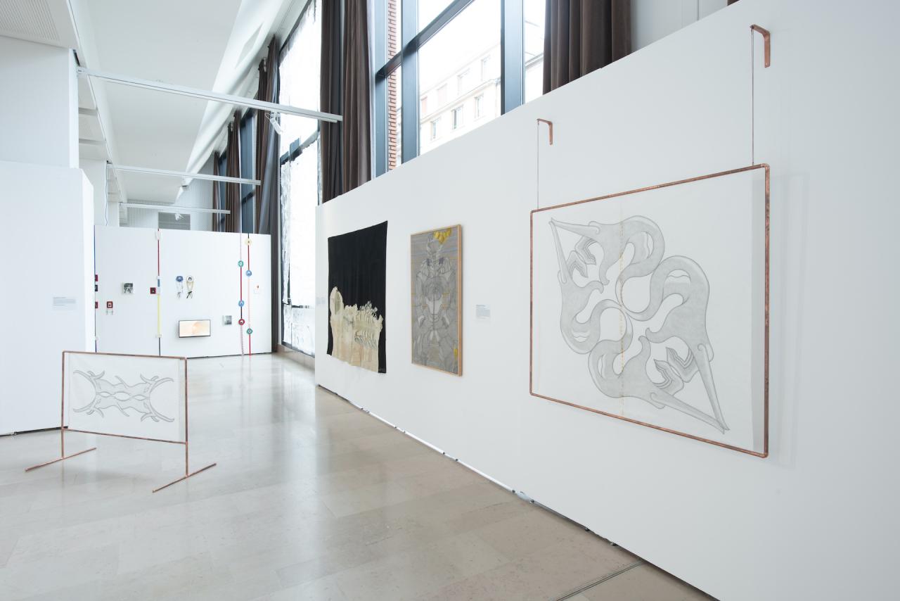 Protest Sign (The Horned), 2023, installation, dessin au graphite sur papier de riz cristallisé, de fil de cuivre et d’une structure en tube de cuivre, 98 x 142 x 62 cm, détail