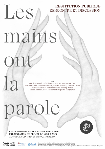 « Les mains ont la parole » propose un contexte propice à la rencontre, à l’altérité et à la transmission entre l’artiste entendant Geoffrey Badel, le chorégraphe entendant Daniel Lühmann, son collaborateur, et les membres du Pôle Adultes de l’ARIEDA (Association Régionale pour l’Intégration et l’Éducation des Déficients Auditifs) qui accompagne les adultes sourds depuis 1982 à Montpellier. D’août à octobre, l’artiste plasticien a accueilli chaque mercredi un groupe de quinze personnes sourdes dans son atelier.