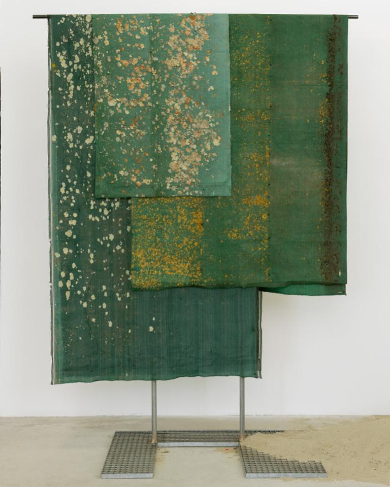 Toiles de brise-vues trouvées en Ariège et dans les Landes, pneus trouvés en lisière de forêt dans le Lot, sable de la plage de Dunkerque, réservoirs d’eau assemblés et son d’arrosage automatisé, résistances chauffantes, portants en acier sur caillebotis, vieux jerricane bricolé diffusant WD40, bouteille de gaz bricolée et son brumisateur d’eau de mer.