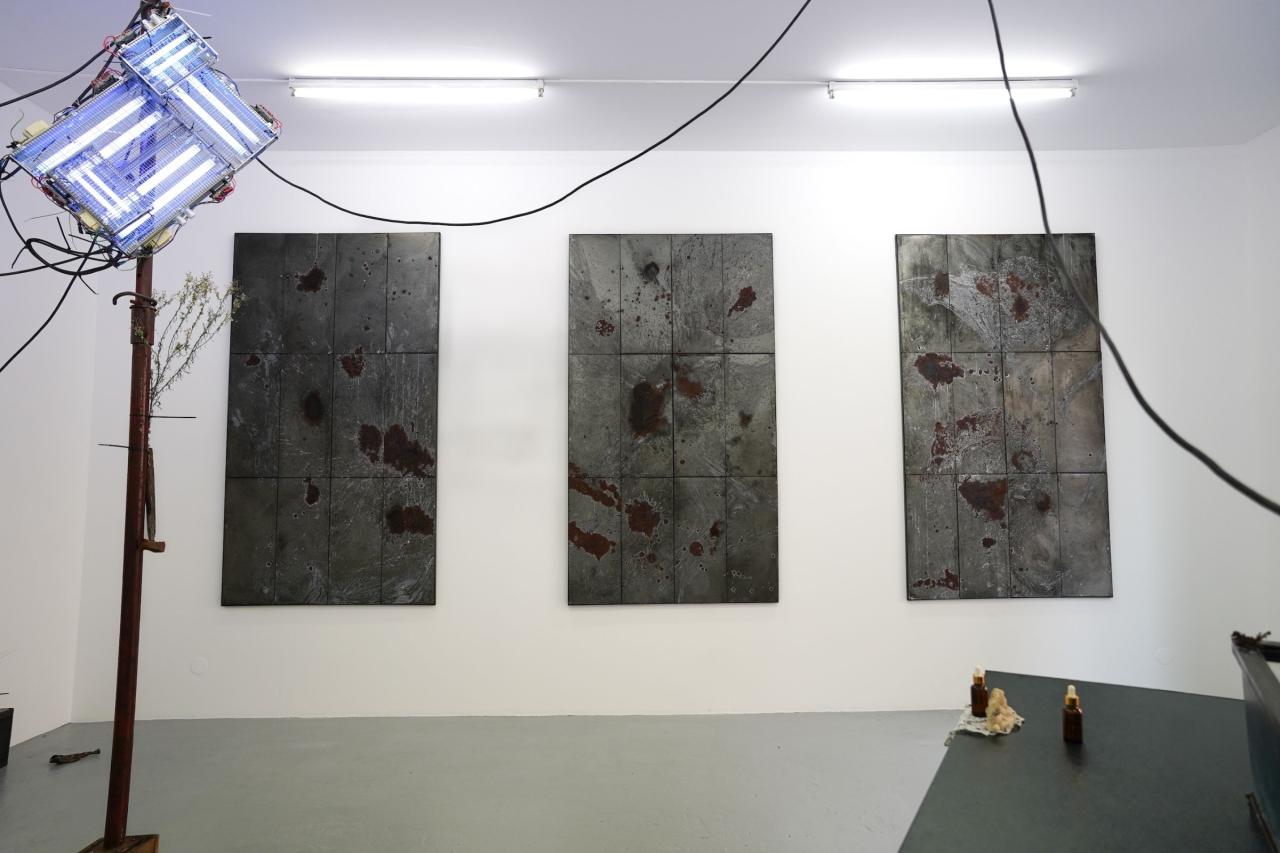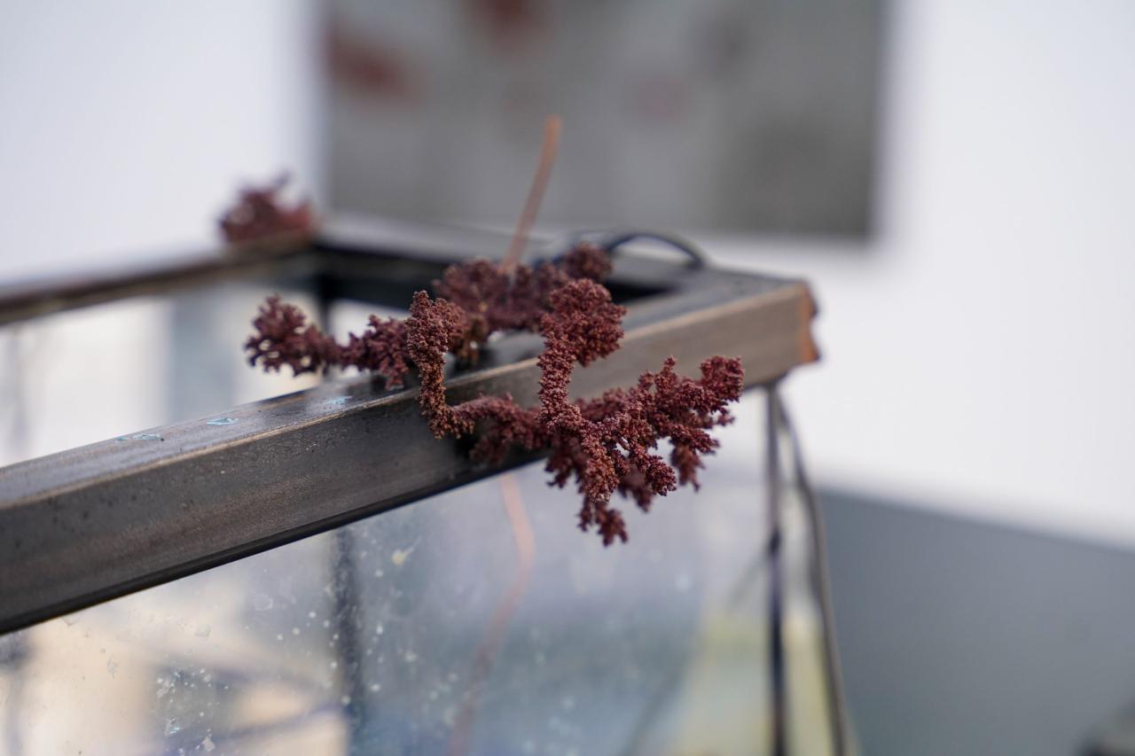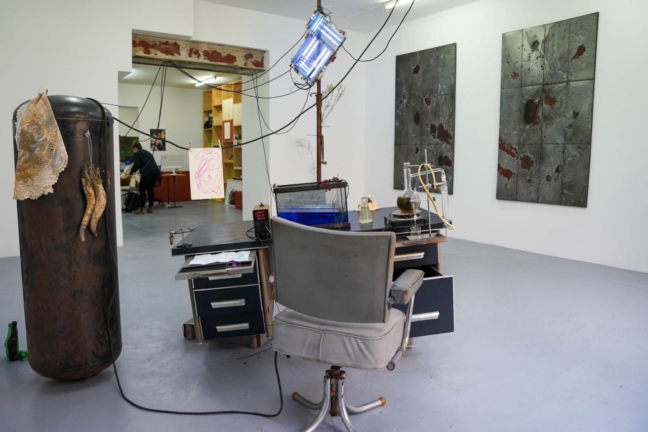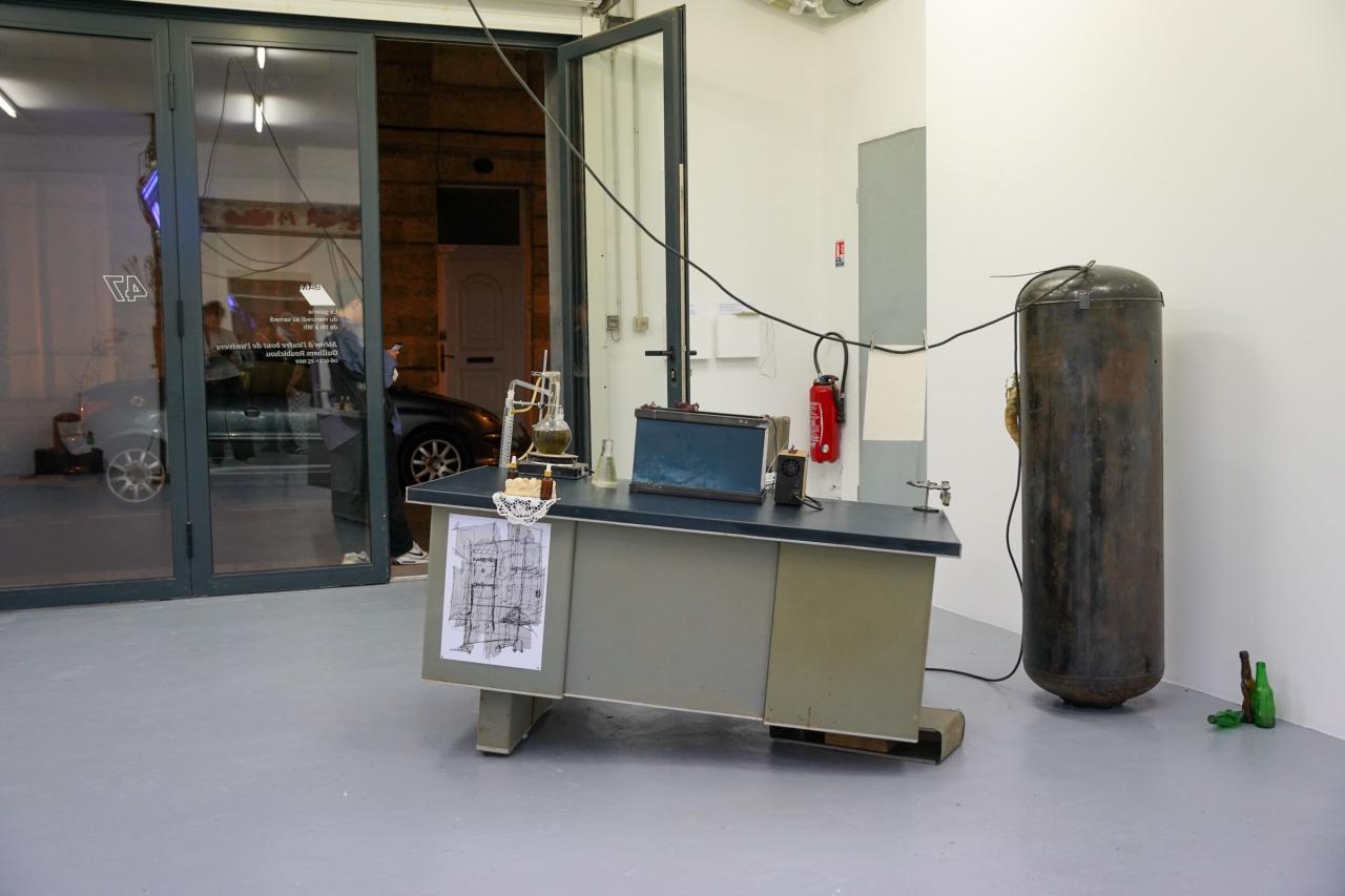 Bureau et fauteuil industriels provenant de la briqueterie abandonnée de Saverdun, éléments de chimie et parfumerie, bain d’électrolyse pour électroforming cuivre, porte tampon, tampon et fiole contenant un prélèvement aérien de l’atelier de l’artiste en Ariège, mousse végétale, deux dessins « carte aux trésors » par Noé Roubichou, dessin imprimé Même à l’autre bout de l’univers, cuves en acier provenant de l’installation Dernière brise, l’horizon des évènements, éléments de dentelle et napperons récupérés auprès de vieilles dames dans les Hauts-de-France et utilisés pour la réalisation des STEEL ACID, cornes trouvées lors d’une résidence au Bel Ordinaire à Pau, bouteilles de bière fondues dans un feu après un apéro en montagne, lampe tueuse d’insectes de l’œuvre Lucifer, étai ayant maintenu le plafond de l’atelier de l'artiste, marteau retrouvé au Garage Portet lors d’une résidence avec l’association PAHLM, captation sonore de Lucifer, mauvaises herbes récupérées dans le quartier des Chartrons à Bordeaux, protocole d’installation fourni avec l’oeuvre.