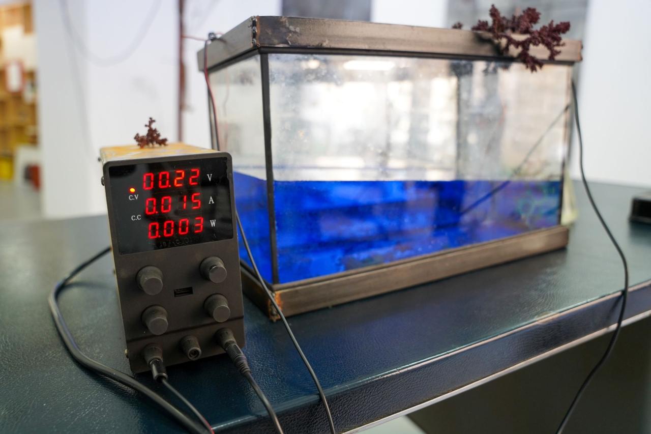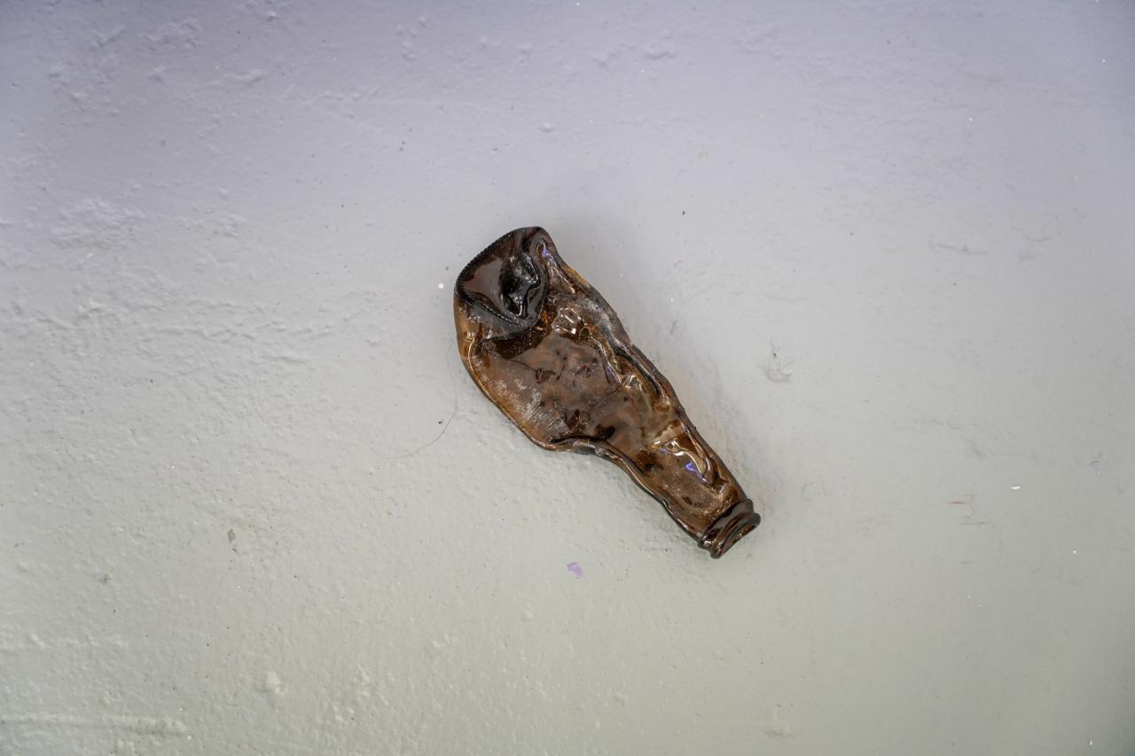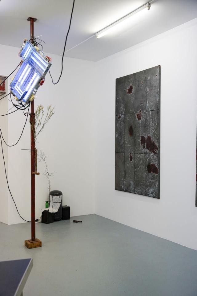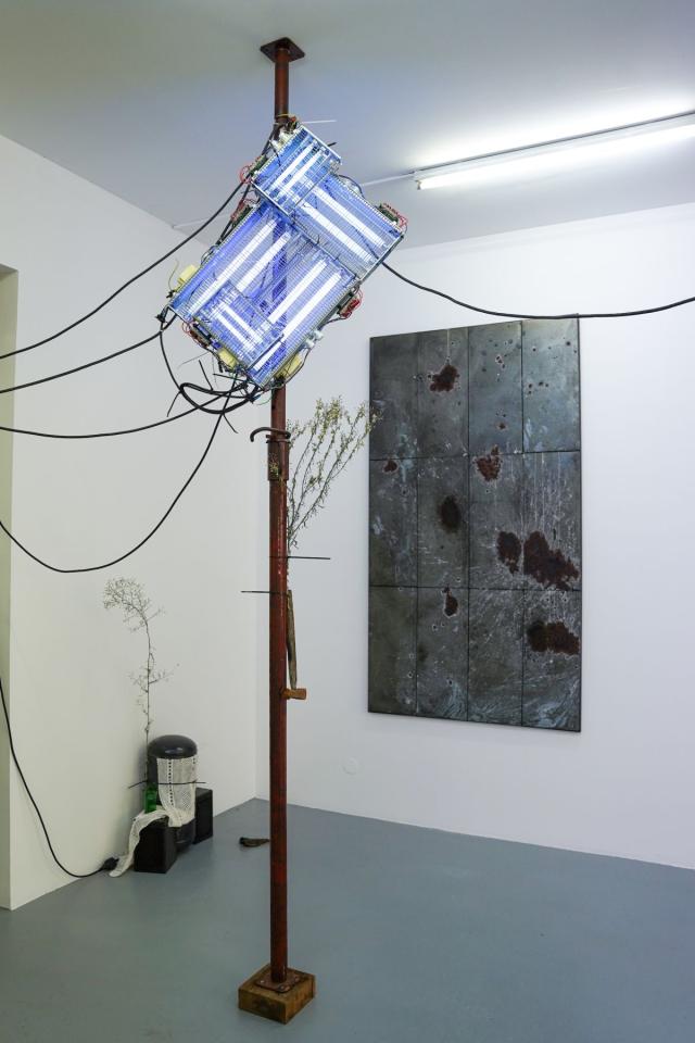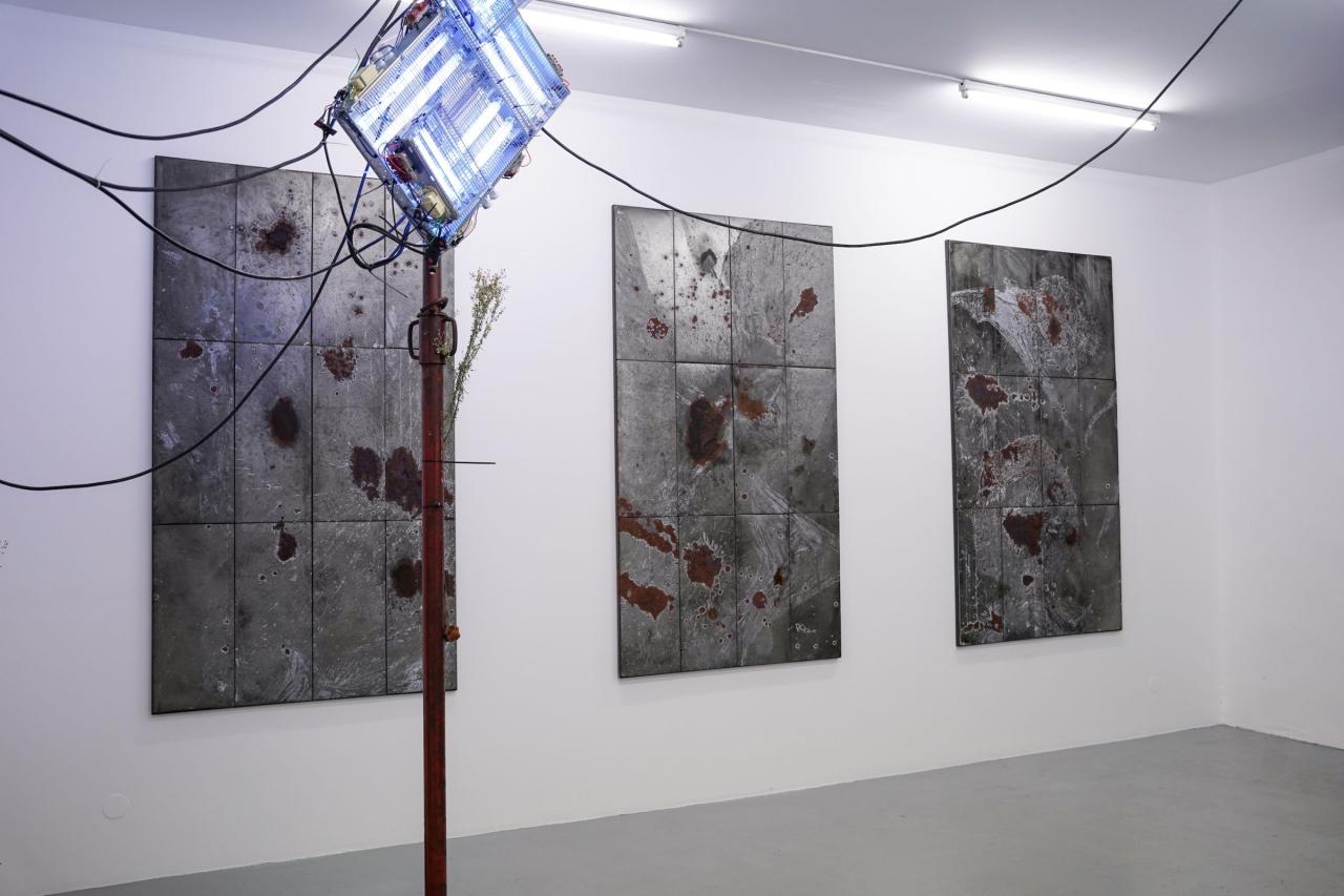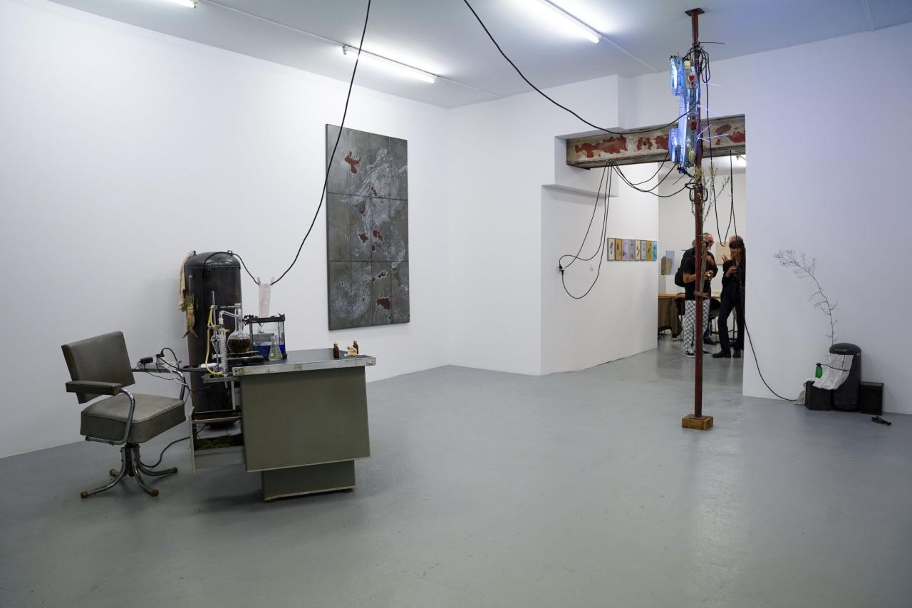 Bureau et fauteuil industriels provenant de la briqueterie abandonnée de Saverdun, éléments de chimie et parfumerie, bain d’électrolyse pour électroforming cuivre, porte tampon, tampon et fiole contenant un prélèvement aérien de l’atelier de l’artiste en Ariège, mousse végétale, deux dessins « carte aux trésors » par Noé Roubichou, dessin imprimé Même à l’autre bout de l’univers, cuves en acier provenant de l’installation Dernière brise, l’horizon des évènements, éléments de dentelle et napperons récupérés auprès de vieilles dames dans les Hauts-de-France et utilisés pour la réalisation des STEEL ACID, cornes trouvées lors d’une résidence au Bel Ordinaire à Pau, bouteilles de bière fondues dans un feu après un apéro en montagne, lampe tueuse d’insectes de l’œuvre Lucifer, étai ayant maintenu le plafond de l’atelier de l'artiste, marteau retrouvé au Garage Portet lors d’une résidence avec l’association PAHLM, captation sonore de Lucifer, mauvaises herbes récupérées dans le quartier des Chartrons à Bordeaux, protocole d’installation fourni avec l’oeuvre.