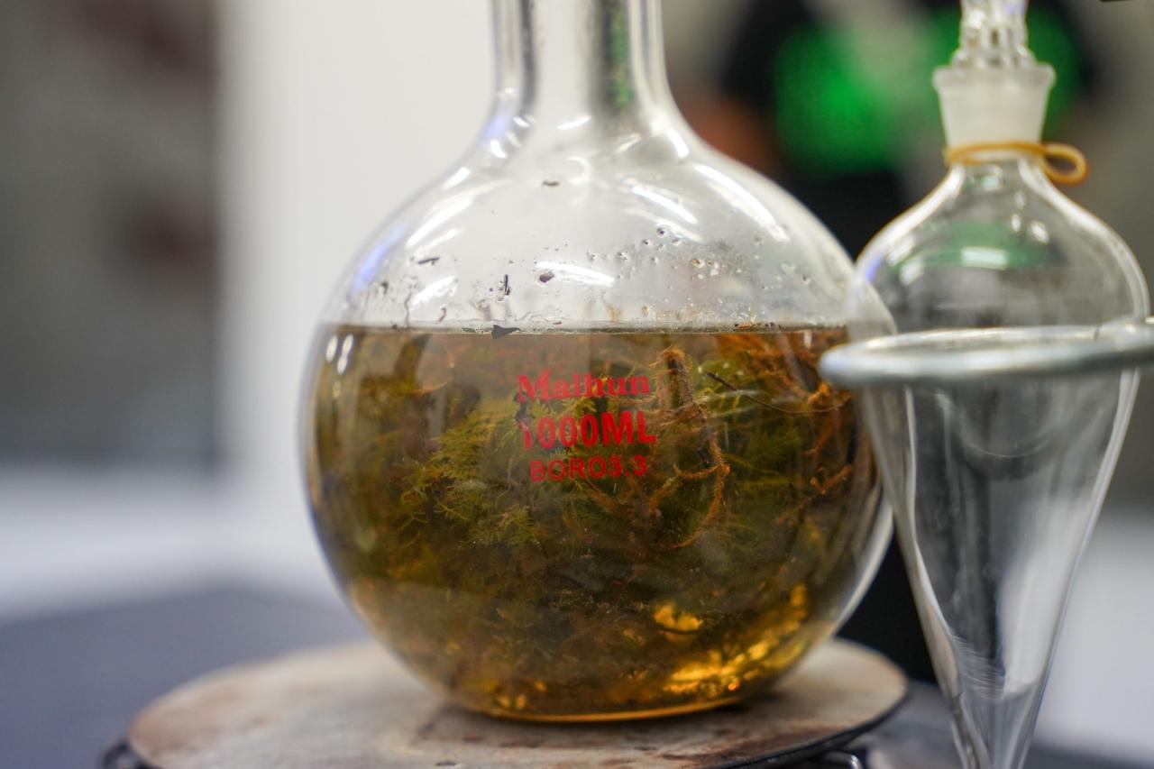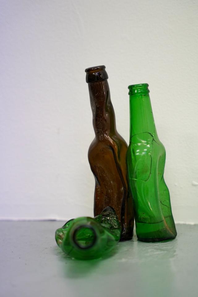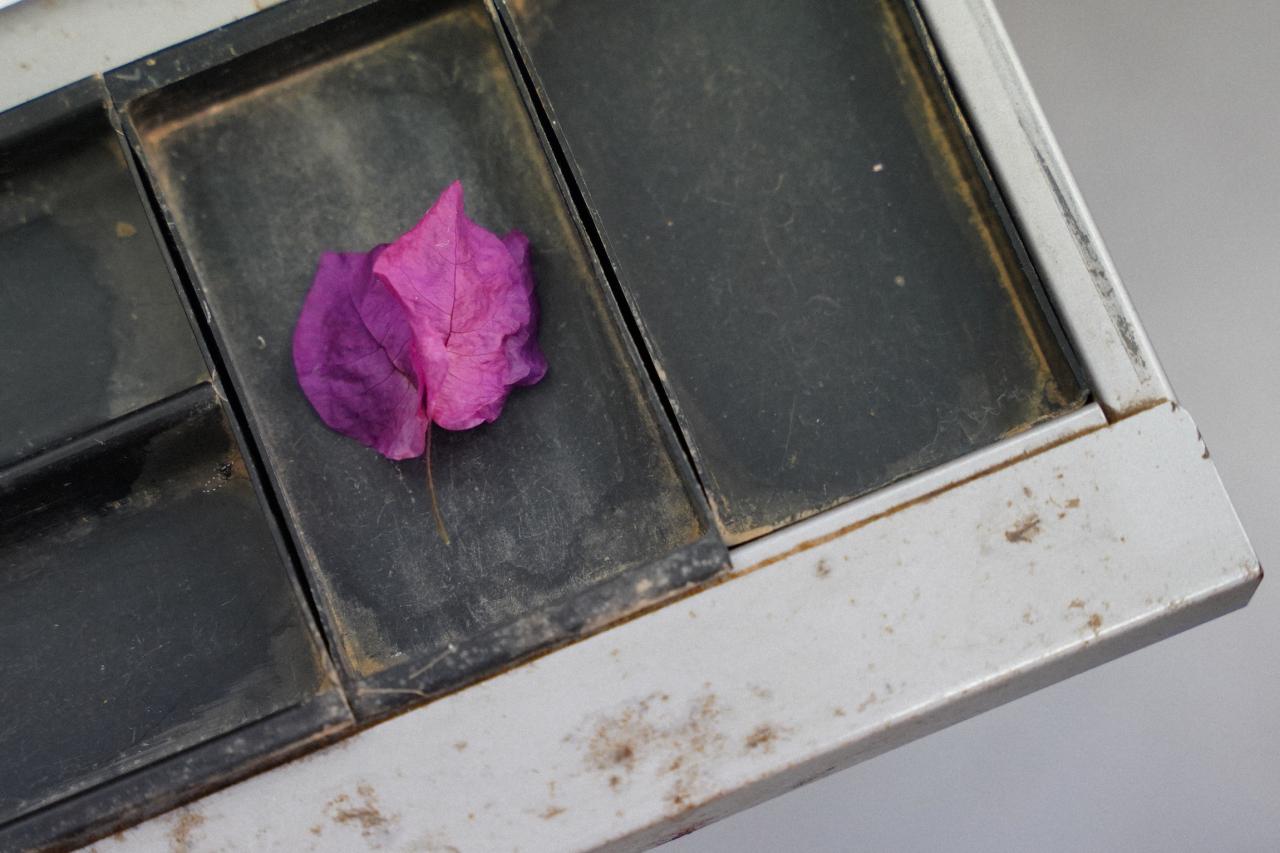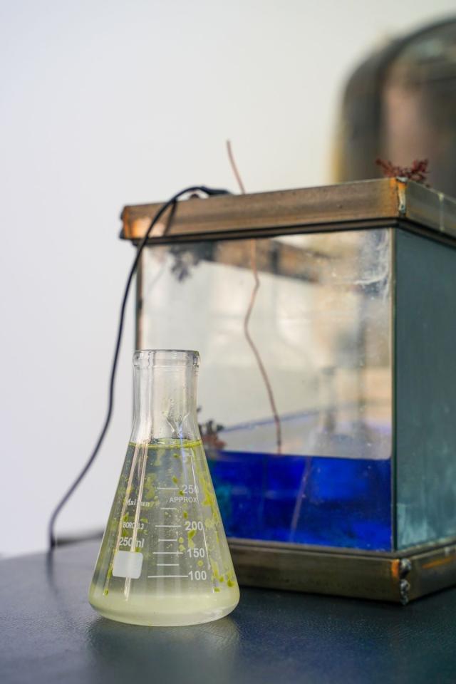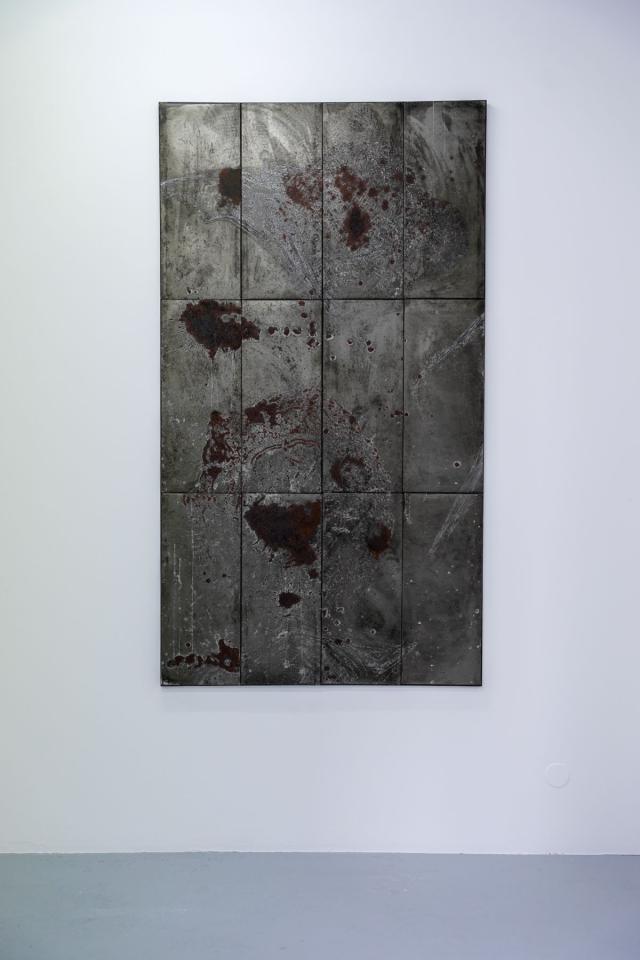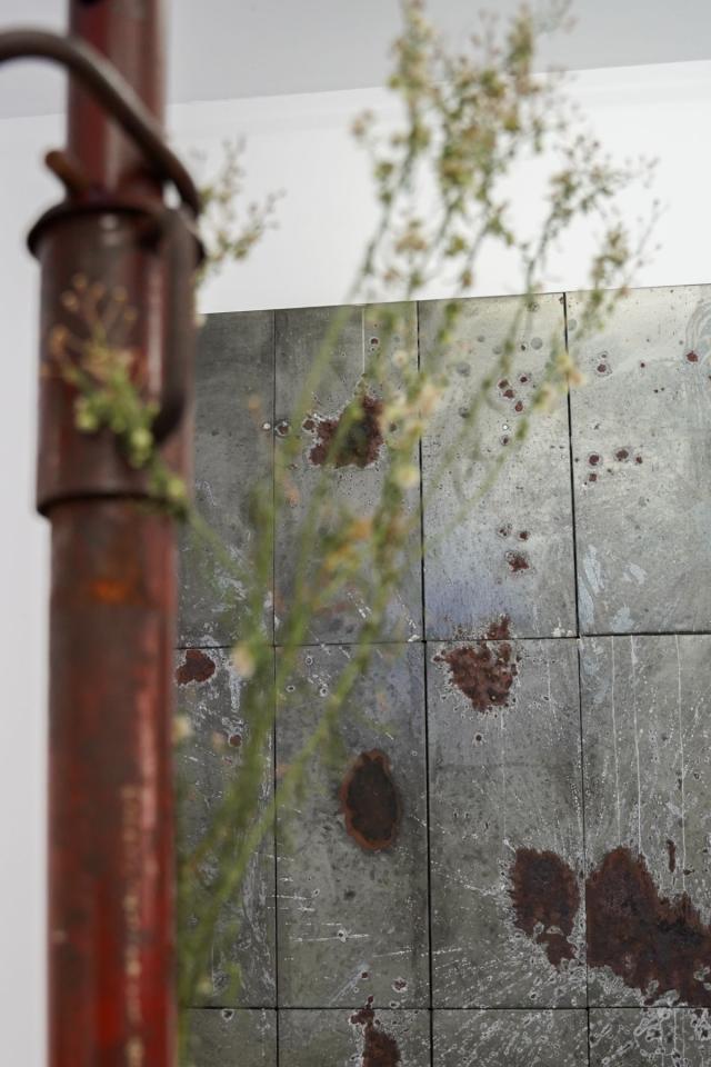 Bureau et fauteuil industriels provenant de la briqueterie abandonnée de Saverdun, éléments de chimie et parfumerie, bain d’électrolyse pour électroforming cuivre, porte tampon, tampon et fiole contenant un prélèvement aérien de l’atelier de l’artiste en Ariège, mousse végétale, deux dessins « carte aux trésors » par Noé Roubichou, dessin imprimé Même à l’autre bout de l’univers, cuves en acier provenant de l’installation Dernière brise, l’horizon des évènements, éléments de dentelle et napperons récupérés auprès de vieilles dames dans les Hauts-de-France et utilisés pour la réalisation des STEEL ACID, cornes trouvées lors d’une résidence au Bel Ordinaire à Pau, bouteilles de bière fondues dans un feu après un apéro en montagne, lampe tueuse d’insectes de l’œuvre Lucifer, étai ayant maintenu le plafond de l’atelier de l'artiste, marteau retrouvé au Garage Portet lors d’une résidence avec l’association PAHLM, captation sonore de Lucifer, mauvaises herbes récupérées dans le quartier des Chartrons à Bordeaux, protocole d’installation fourni avec l’oeuvre.