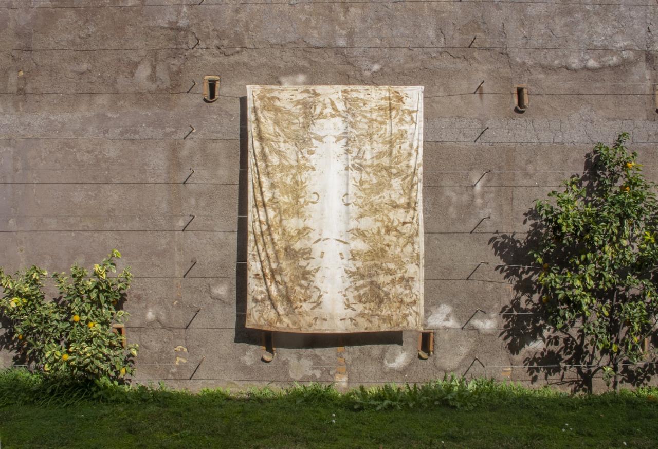 Braîches, 2021, teintures végétales sur drap ancien, vue de la restitution de résidence Allée des orangers, dans le cadre du Prix Occitanie – Médicis 2020, Villa Médicis, Rome, Italie