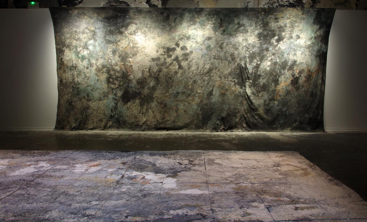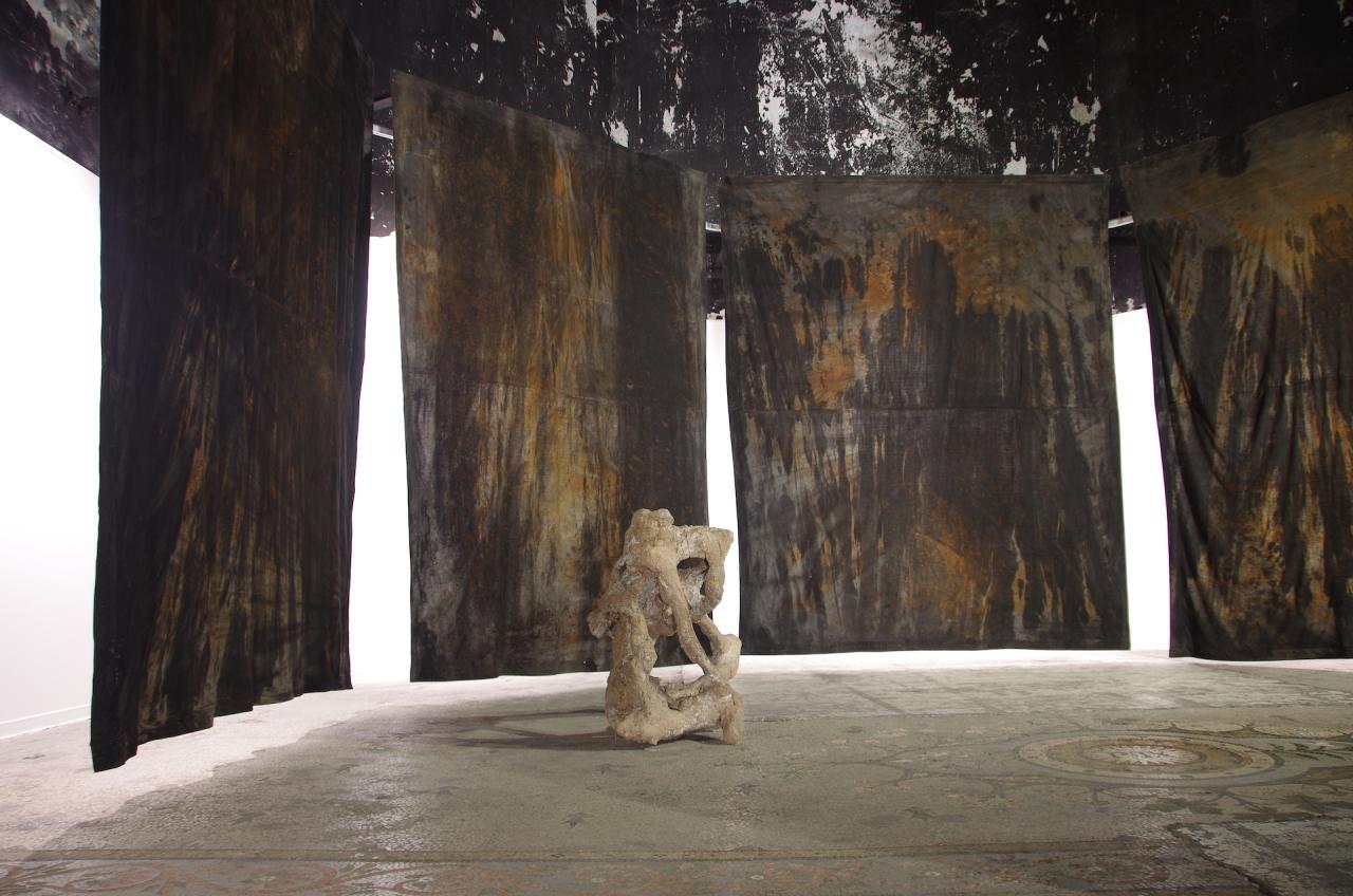 Réalisées en résidence dans les ateliers de la ville durant le mois précédant l’exposition, Matrice et Épreuves, respectivement dalle de béton et de peinture et vastes toiles estampées au cours de la fabrication de celle-ci, intègrent l’espace de la chapelle, en prolongent les murs noircis, en réorganisent les perspectives. Autour de ce geste central, des corps étranges dansent, entre outils et rebus du chantier. Des objets manufacturés, glanés au fil des reconnaissances puis pétrifiés dans un enduit ferrugineux oxydé à l’eau de mer donnent lieu à des formes tortueuses, indéfinies.
