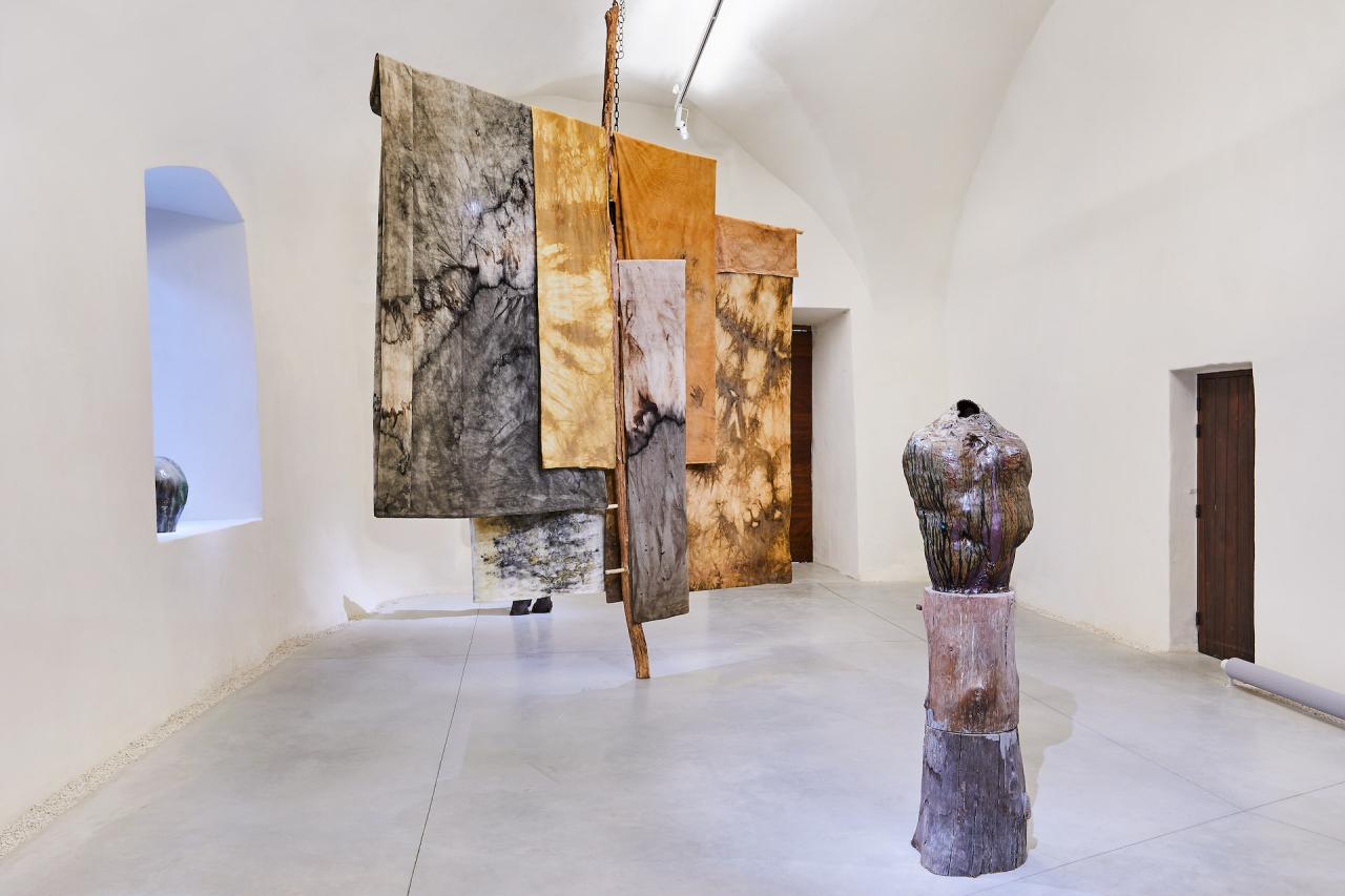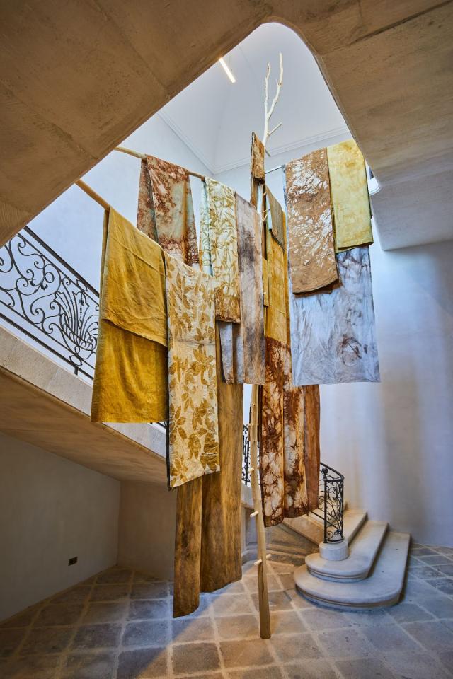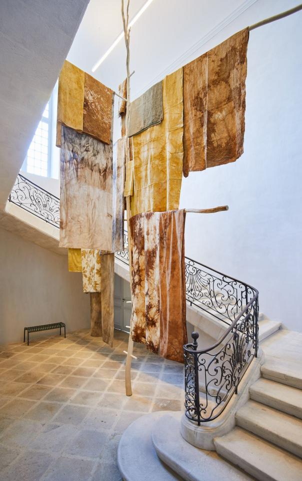Echelle+Braîches, 2024, installation, draps, teintures végétales et bois, vue de l’exposition Dans une rouge Clairière, 2024, le Château Centre d’Art Contemporain et du Patrimoine d’Aubenas, Aubenas, photo Laurent Lecat