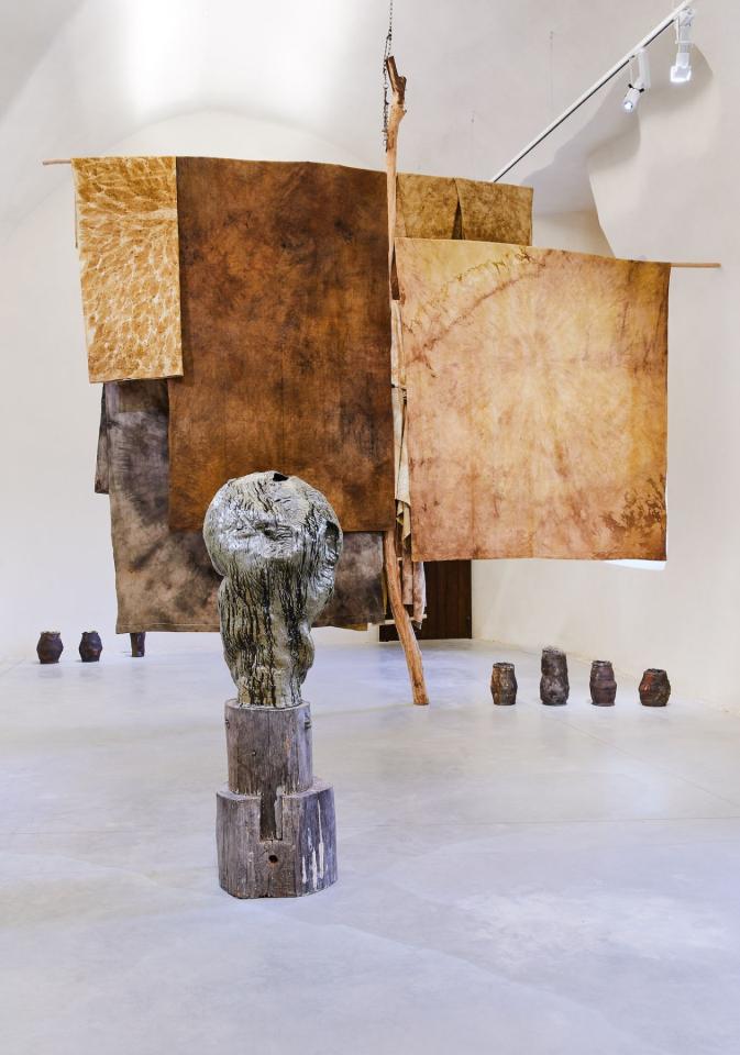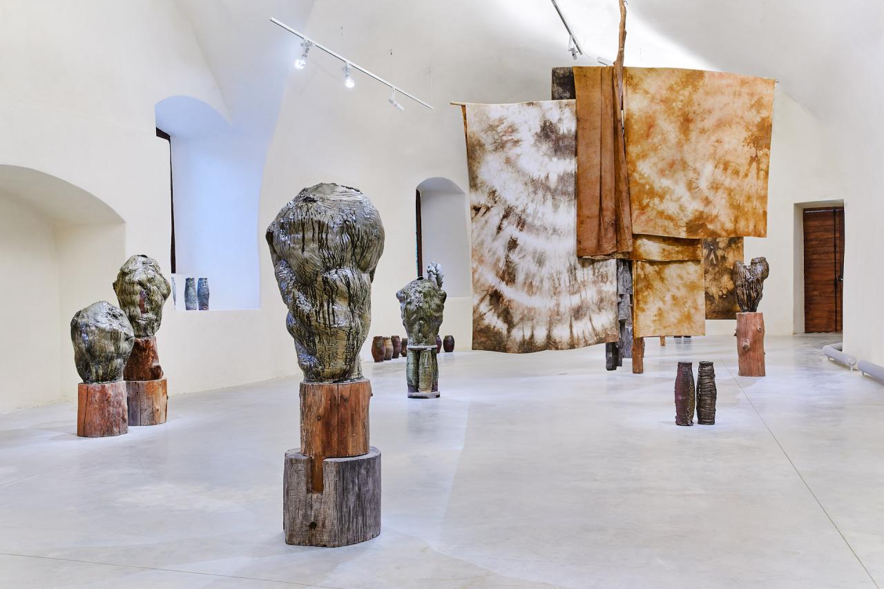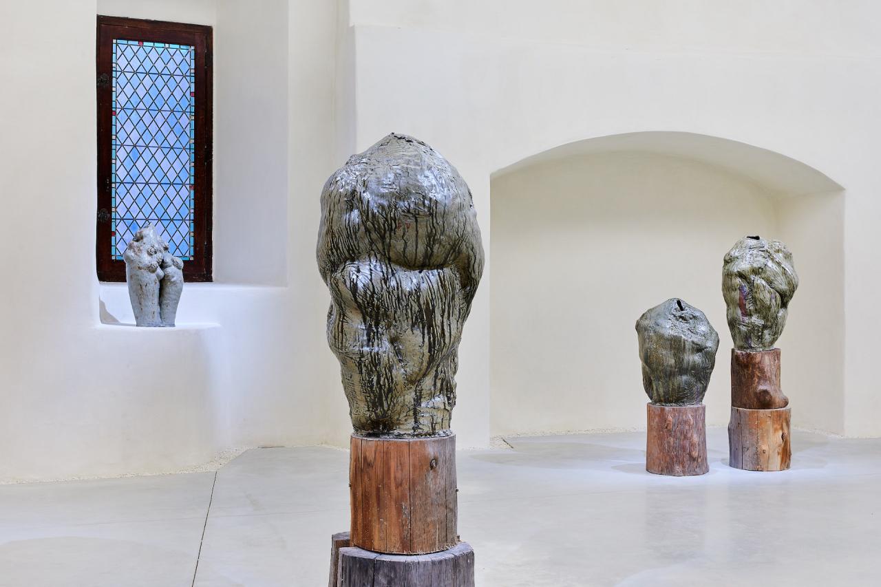 Trogne, 2024, sculpture, grès et terre de cueillette, vue de l’exposition Dans une rouge Clairière, 2024, le Château Centre d’Art Contemporain et du Patrimoine d’Aubenas, Aubenas, photo Laurent Lecat