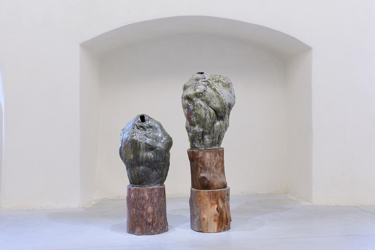 Pott, 2024, sculpture, grès, émail de cendres de tilleul et bois, vue de l’exposition Dans une rouge Clairière, 2024, le Château Centre d’Art Contemporain et du Patrimoine d’Aubenas, Aubenas, photo Laurent Lecat