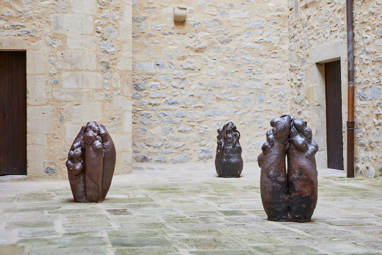 Trognes, 2024, ensemble de sculpture, grès, terre de cueillette et pierre volcanique, vue de l’exposition Dans une rouge Clairière, 2024, le Château Centre d’Art Contemporain et du Patrimoine d’Aubenas, Aubenas, photo Laurent Lecat