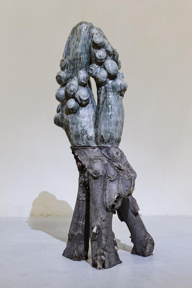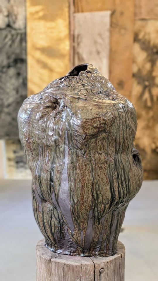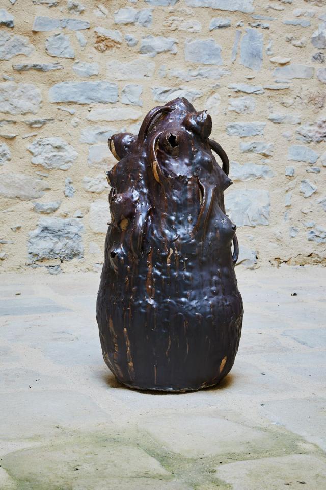 Pott, 2024, sculpture, grès, terre de cueillette, émail de cendres de tilleul et bois, vue de l’exposition Dans une rouge Clairière, 2024, le Château Centre d’Art Contemporain et du Patrimoine d’Aubenas, Aubenas, détail, photo Laurent Lecat