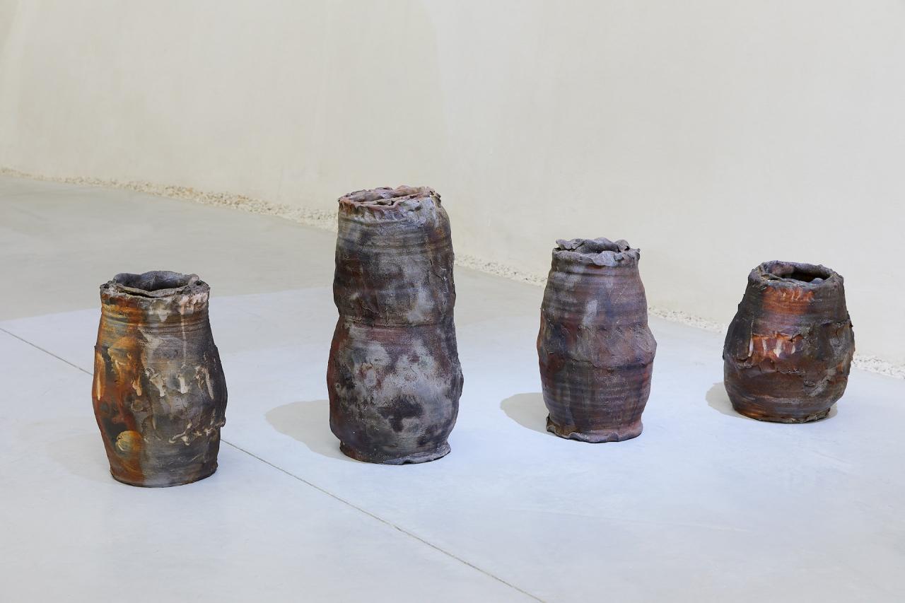 Vaisseaux, 2024, sculptures, grès brut, vue de l’exposition Dans une rouge Clairière, 2024, le Château Centre d’Art Contemporain et du Patrimoine d’Aubenas, Aubenas, photo Laurent Lecat