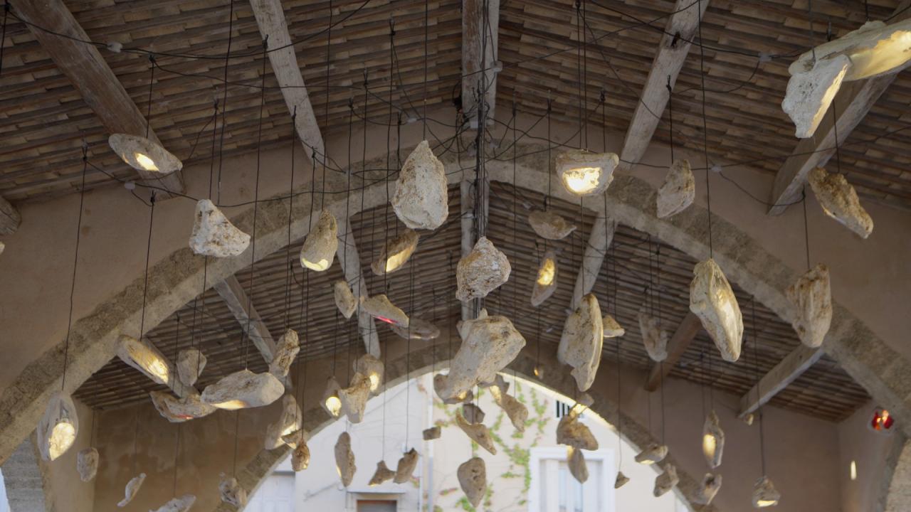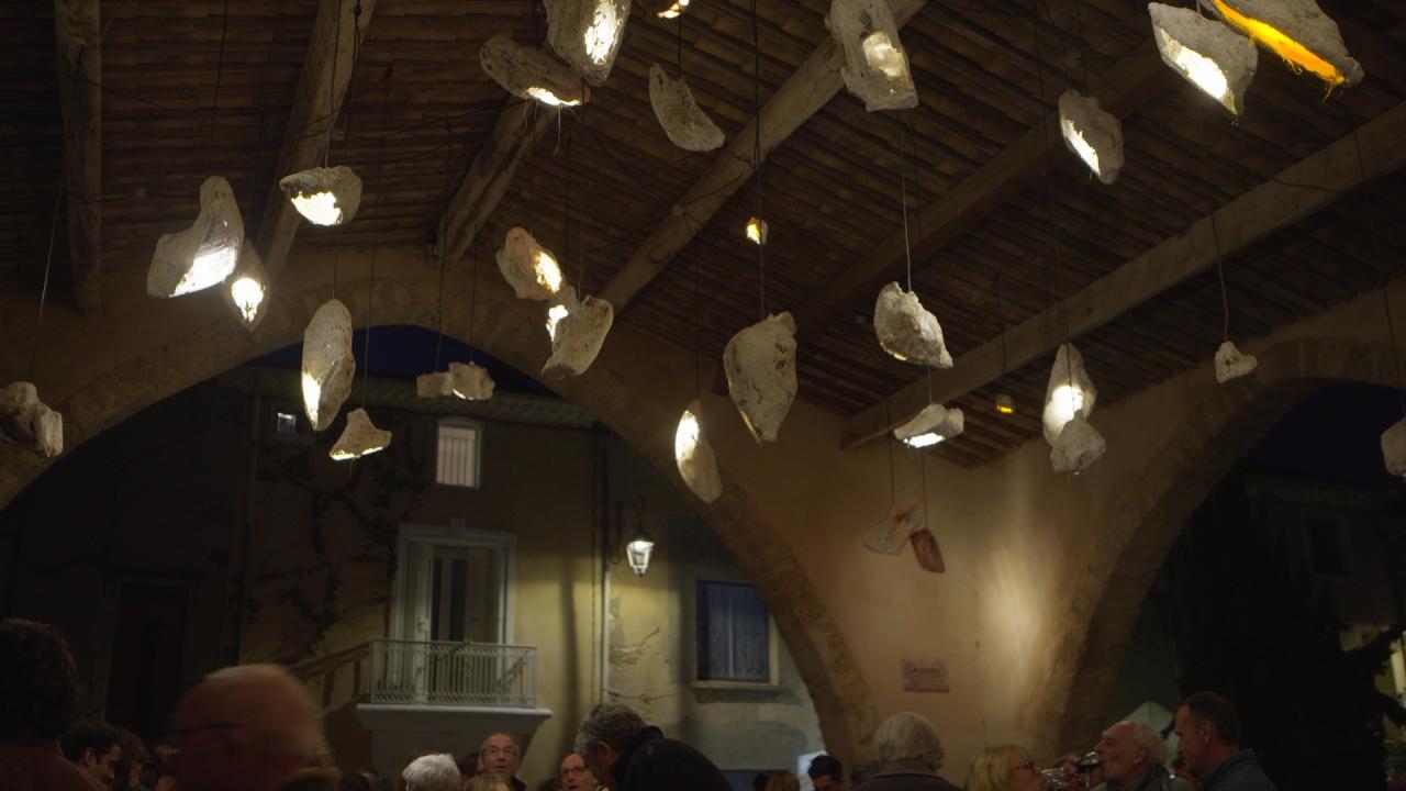 Alimentées par le réseau d’éclairage public, les lampes subiront chaque jour leur métamorphose, le moment de l’éclairage transcendant leur minéralité figée, et transfigurant l’espace de la halle. A Montpeyroux, la halle est le point central du village, là où les routes convergent, là où les rencontres sont possibles.