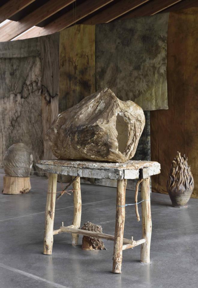 Braîches, Fûts, 2023, draps, teintures végétales et grès, vue de l’exposition Mondo alterado, 2023, Centre de céramique Contemporaine La Borne, Henrichemont, détail, photo Rebecca Fanuele