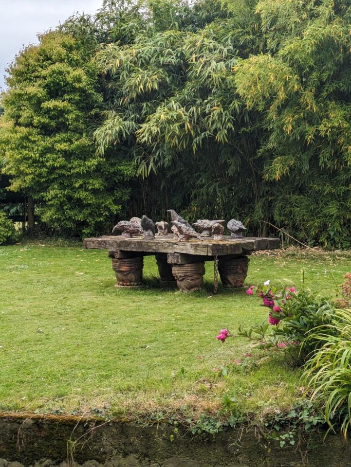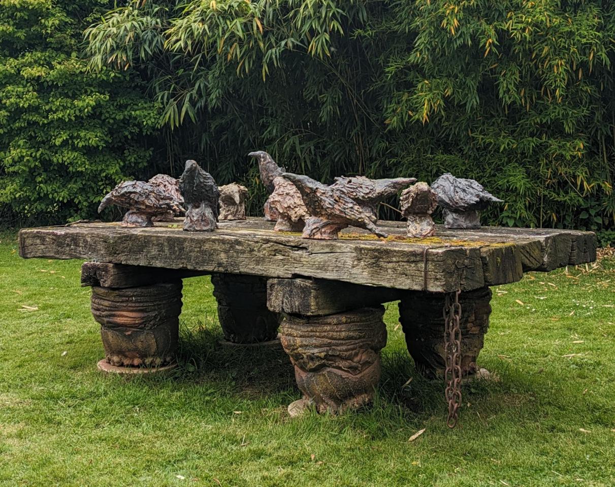 Dans le Jardin de Boisbelle, à la sortie du four, les Couales, corbeaux de grès formés à quatre mains à mi-chemin entre la tradition des épis de faîtage, élément architectural qui orne les toits du berry, et sculptures zoomorphes, ont peu à peu envahi la table d’Hervé Rousseau, sept traverses de chemin de fer qui reposent sur une série de quatre pots “pieds d’éléphants”.