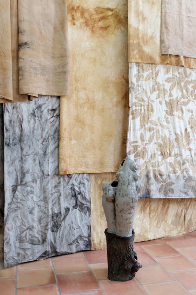 Braîches, 2024, installation, draps et teintures végétales, vue de l’exposition collective Tilia, 2024, Moly-Sabata, Sablons, détail, photo Frédéric Houvert