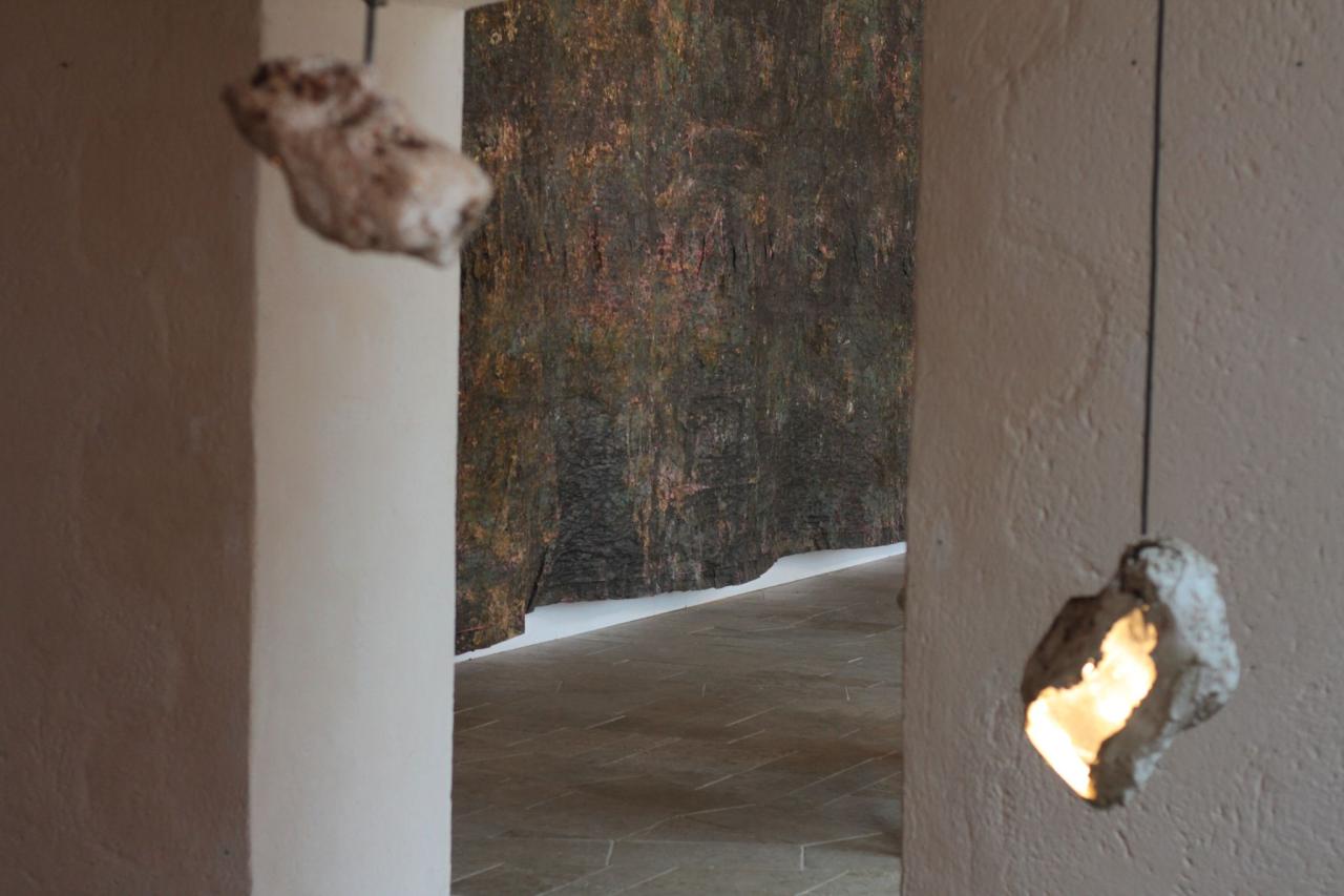 Karst, 2019, optique automobile, filasse, plâtre, limaille de fer et câble électrique, vue de l’exposition Ventôse, 2019, galerie Sainte Catherine, Rodez, détail