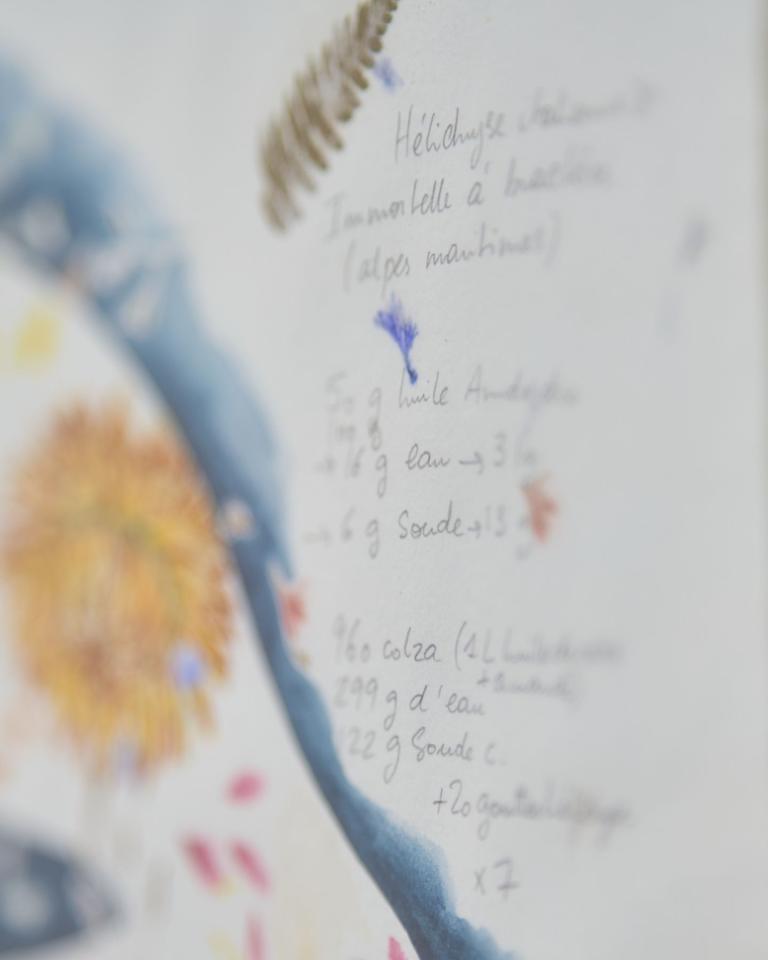 Chang’e, 2024, savon saponifié à froid à l’huile d’amande douce et huile essentielle d’immortelle, immortelles, bois, nécessaire de toilette ancien, dimensions variables, photos Margaux Szymkowicz, détails