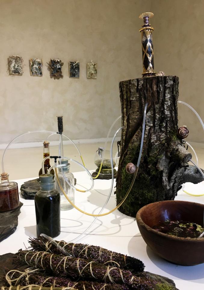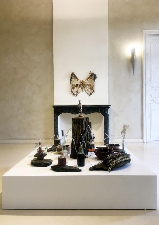 Extrait de magie verte (1), 2022, châtaignier, verrerie ancienne, tube pvc, contenants bois et cuivre, schiste, ficelle, huile d’olive, vodka, miel, vinaigre de cidre, eau, sel, cire de colza, huiles essentielles, poudre d’indigo, plantes séchées, dimensions variables, vues de l’exposition personnelle Pour des utopies sauvages, Château d’Assas, Le Vigan, 2022