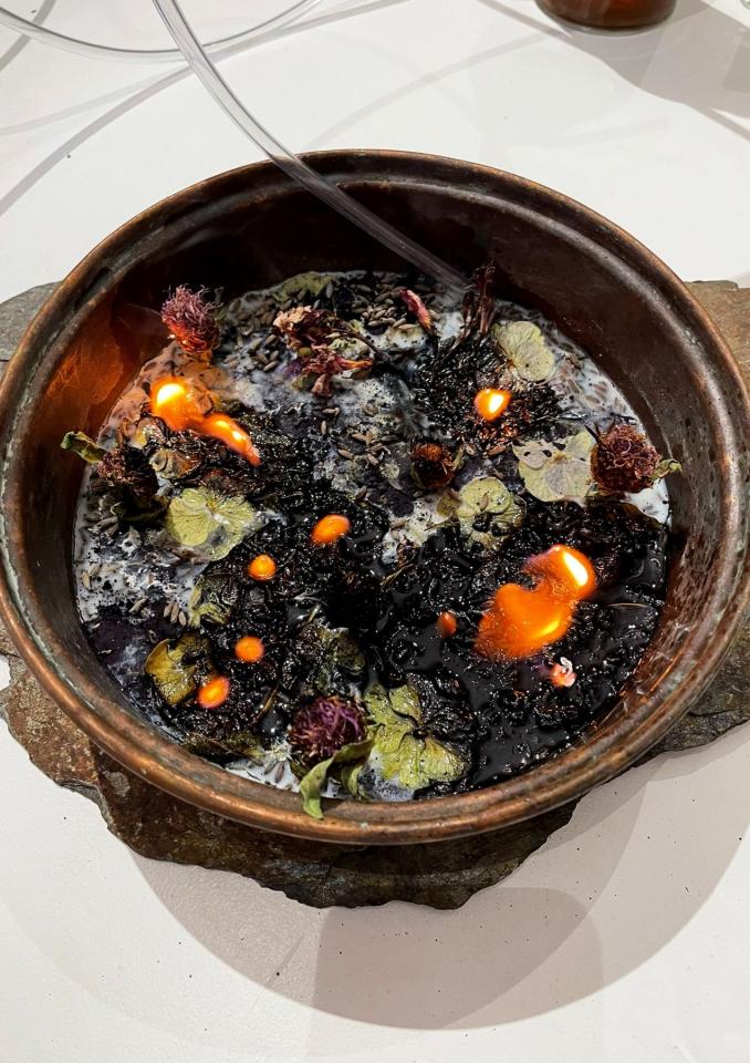 Extrait de magie verte (1), 2022, châtaignier, verrerie ancienne, tube pvc, contenants bois et cuivre, schiste, ficelle, huile d’olive, vodka, miel, vinaigre de cidre, eau, sel, cire de colza, huiles essentielles, poudre d’indigo, plantes séchées, dimensions variables, vues de l’exposition personnelle Pour des utopies sauvages, Château d’Assas, Le Vigan, 2022, détails