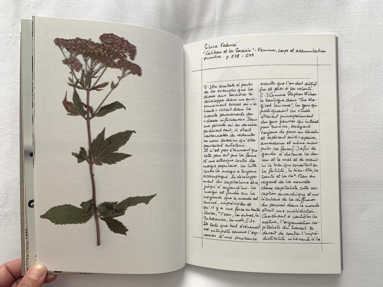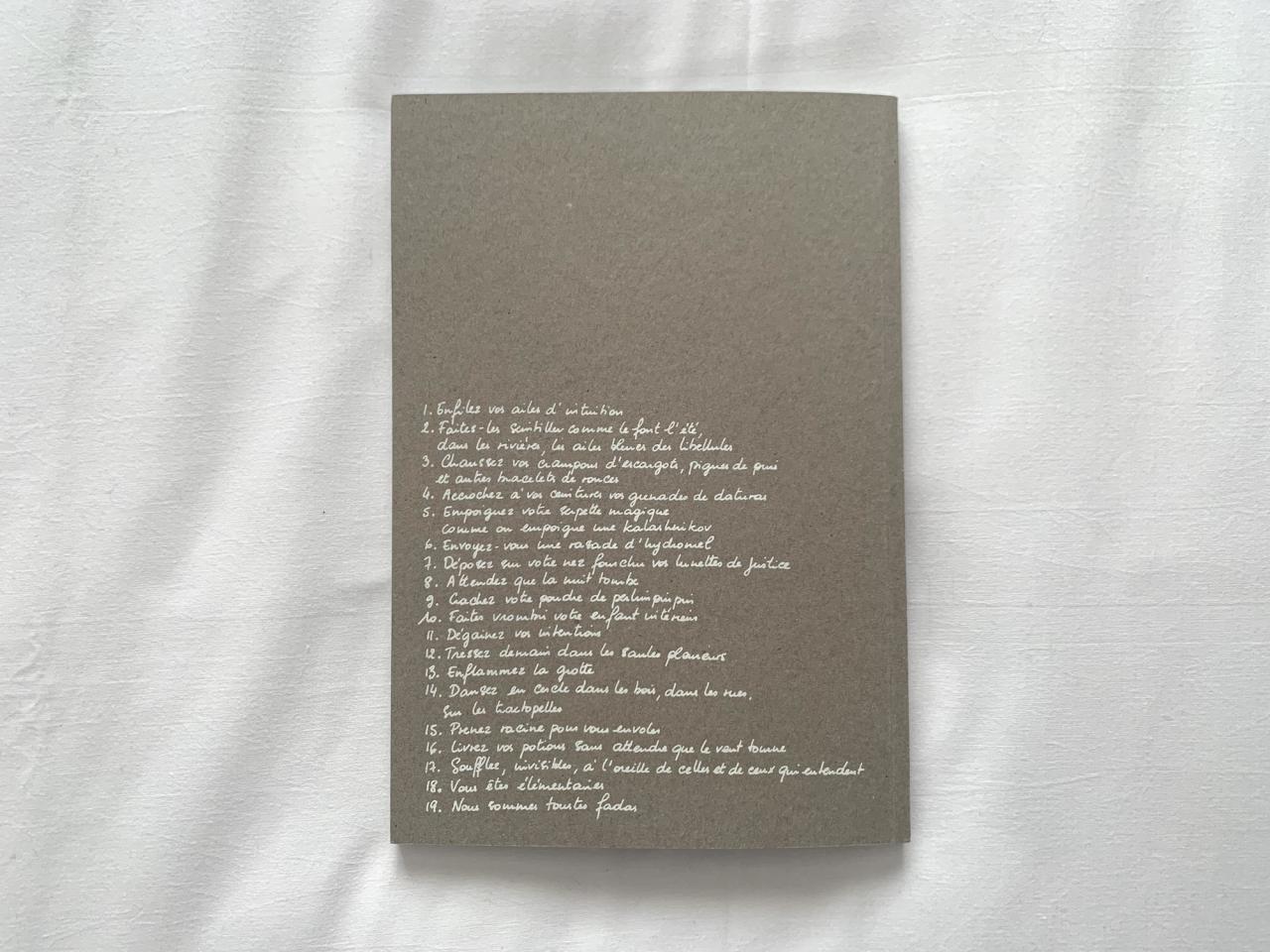 Herbier de plantes et fleurs médicinales, carnet de citations recopiées à toutes fins utiles, catalogue d’armes manufacturées et de serpettes décorées comme des sabres japonais, viatique à emporter pour une drôle d’embardée au milieu des orties, des ronces et des tractopelles, Fadas (de l’occitan fadat, “touché par les fées, fou, niais”) est un manuel de combat pour les “élémentaires” (créatures animées par l’esprit du feu, de l’air, de l’eau ou de la terre) et autres fadas que “nous sommes toustes”.