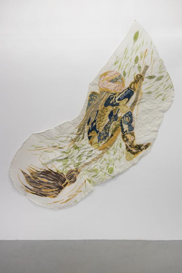 La figure de la sorcière est également centrale dans le travail de Margaux Fontaine comme symbole d’émancipation. Son envolée rageuse, vibration du vivant, prône la toute puissance de la nature sur nos sociétés contemporaines. D’un geste frugal l’artiste a peint et composé avec des végétaux variés, chimies artisanales à base de rouille et tissus récupérés. À vents contraires d’une urgence de vitesse imposée par la société, c’est dans une quête méditative que Margaux Fontaine invoque avec sagesse un retour à une philosophie naturelle.