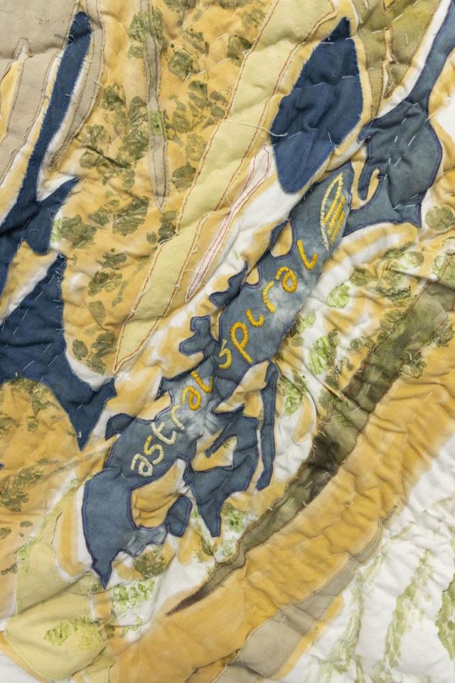 Le vent de l’hiver - Comètes sauvages En spirale astrale, 2022, soupe de clous, teintures végétales tataki zomé, fils, draps anciens, ouatine, 270 x 100 cm, détails
