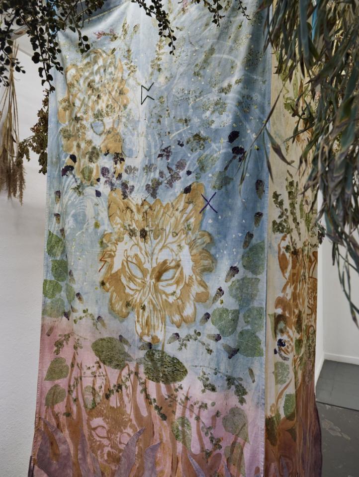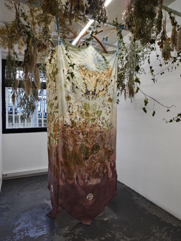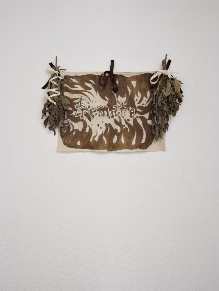 Tremate, 2021, soupe de clous rouillés, teinture à l’oignon, fil, ruban, sauge séchée sur draps anciens, vues de l’exposition collective Tu verras, c’est très beau, CACN, Nîmes, photo François Deladerrière