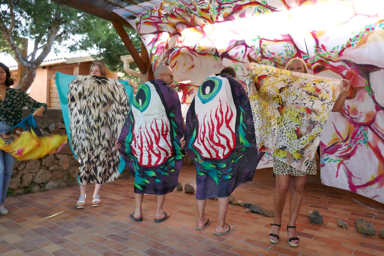 Marianne Plo, artiste résidant à Toulouse, a été sélectionnée pour une résidence de création d’une semaine au camping Le Fun à Fitou. Du 18 au 25 juin, Sylvie, Thierry, propriétaires du camping et l’association PAHLM, Pratiques Artistiques Hors Les Murs, l’ont accueillie dans un mobil-home. Marianne a travaillé sur un grand triptyque inspiré de son propre univers mêlé de l’observation des enrochements et des murs de pierres sèches de la région. Elle a installé dans le camping et au bord de la piscine des peintures et dessins, réalisés sur papier et sur soie, des motifs que l’on devine récurrents. Un défilé de carrés de soie peints par l’artiste et portés par les vacanciers de passage, a clôturé cette résidence.