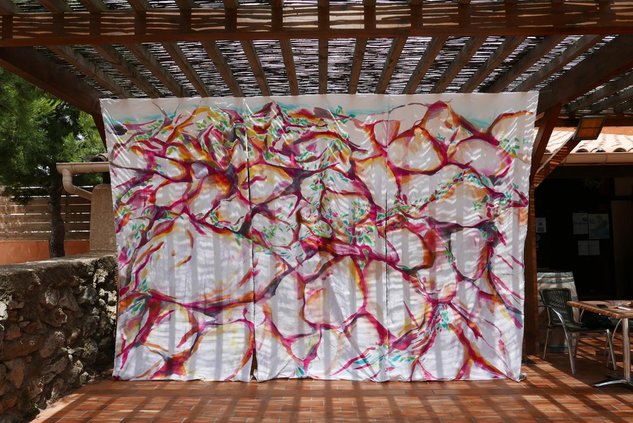 Sans titre, 2019, peinture sur soie, 200 x 300 cm, vue de la sortie de résidence, Camping Le FUN, Fitou
