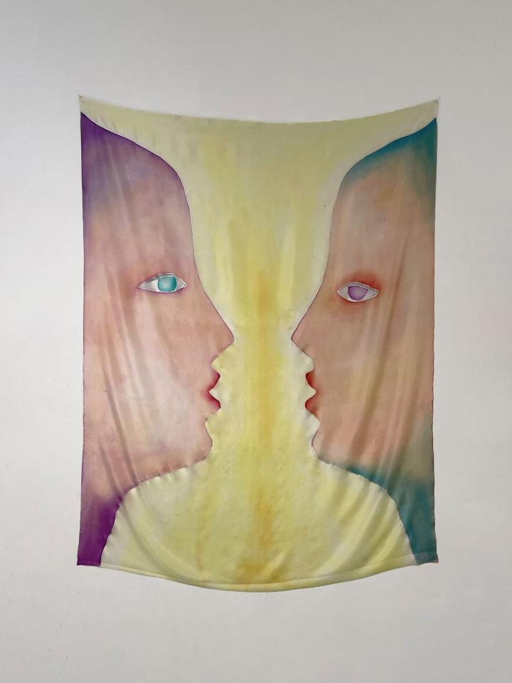Sœurs, 2022, peinture sur soie, 110 x 90 cm, vue de l’exposition Con moto, 2022, Le Salon Reçoit, Toulouse