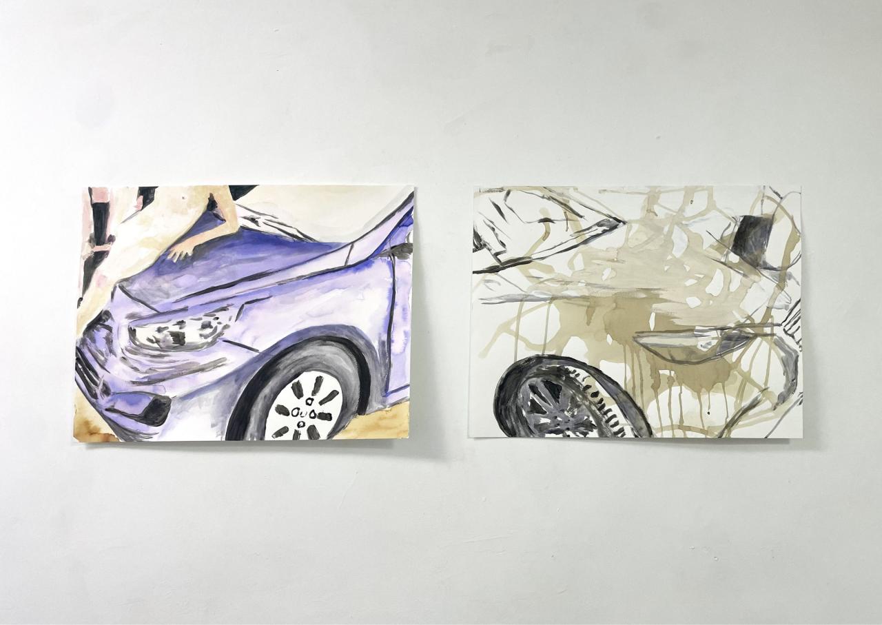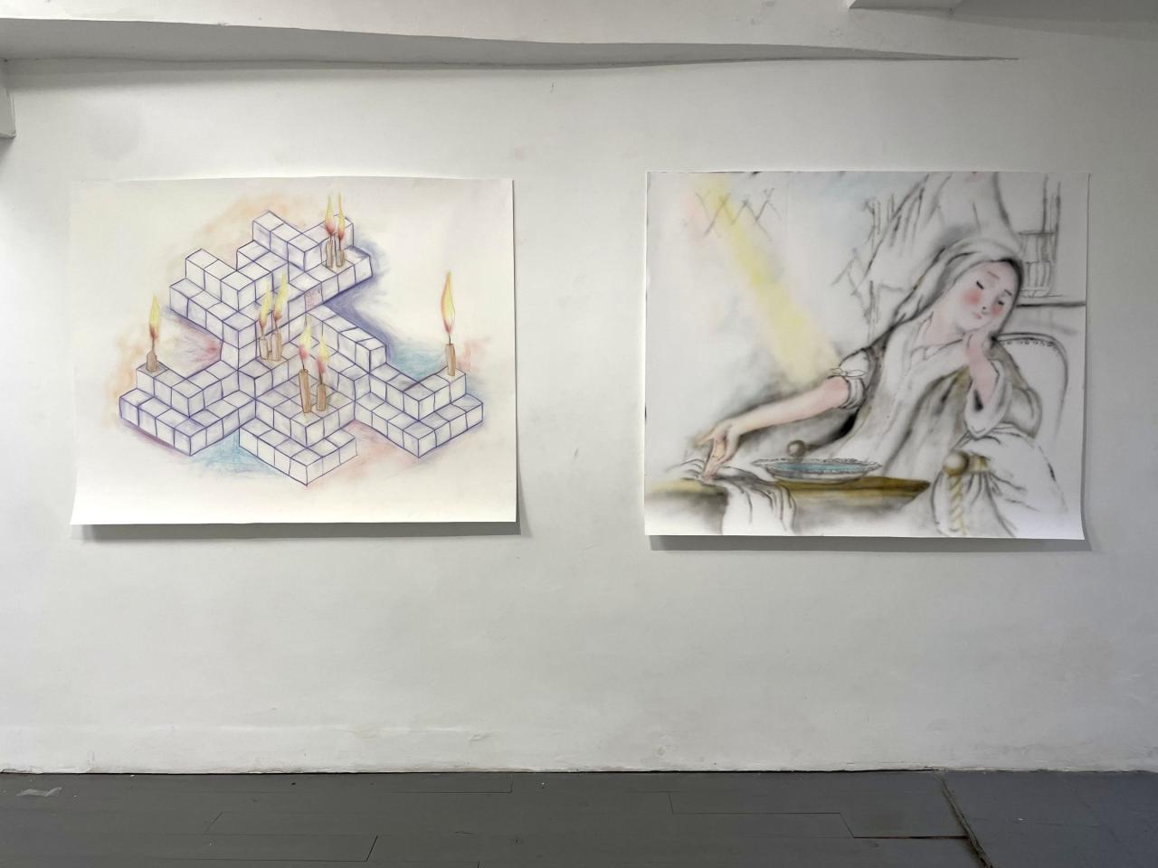 Click on me, 2022, dessin sur papier, 124 x 152 cm, L’Annonciation, 2020, peinture acrylique sur papier, 124 x 152 cm, vue de l’exposition Con moto, 2022, Le Salon Reçoit, Toulouse