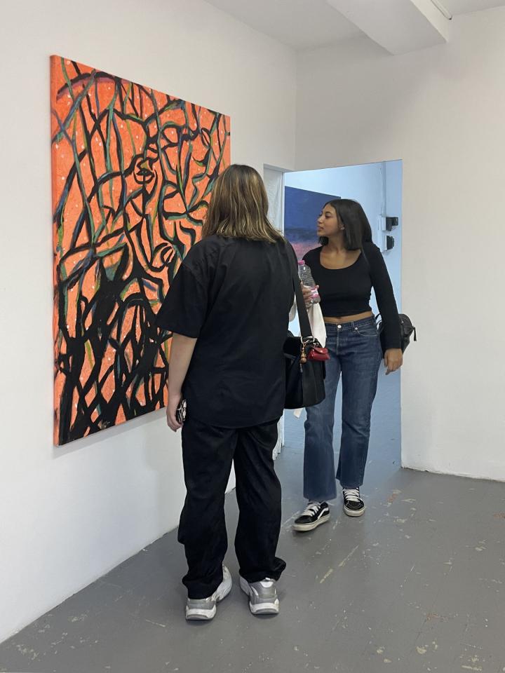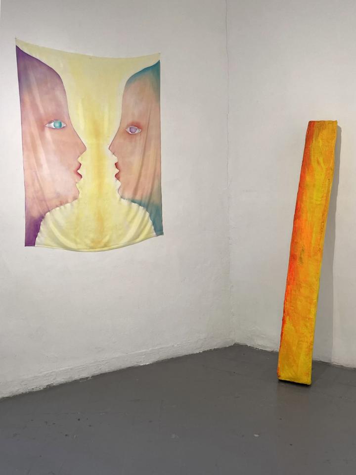 Sœurs, 2022, peinture sur soie, 110 x 90 cm, Sans titre, 2022, sculpture, plâtre et peinture, 120 x 15 x 10 cm, vue de l’exposition Con moto, 2022, Le Salon Reçoit, Toulouse