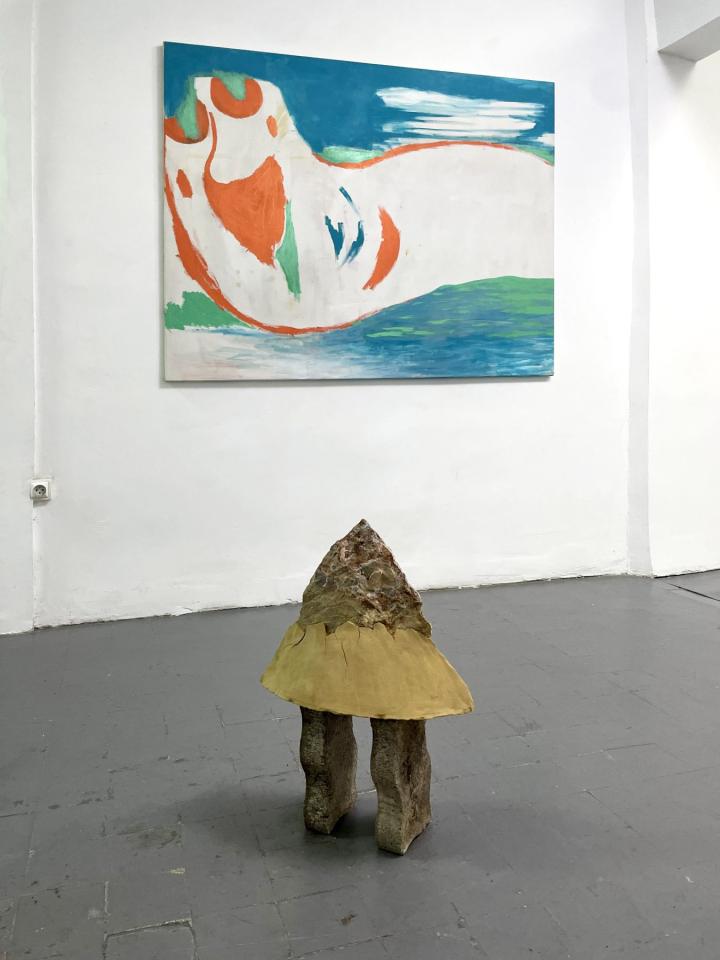 Con moto, 2022, peinture acrylique sur toile, 120 x 150 cm, Sans titre, 2022, marbre, terre et béton, 50 x 20 x 30 cm, vue de l’exposition Con moto, 2022, Le Salon Reçoit, Toulouse