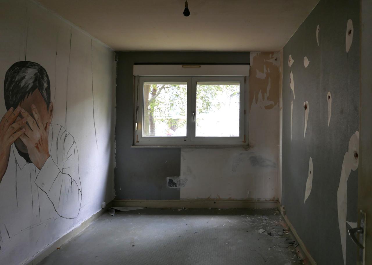 Repentir, 2017, peinture murale et sténopé, 200 x 300 cm, vue de l’exposition Déplacer la croûte, 2017, 19cannes, Toulouse