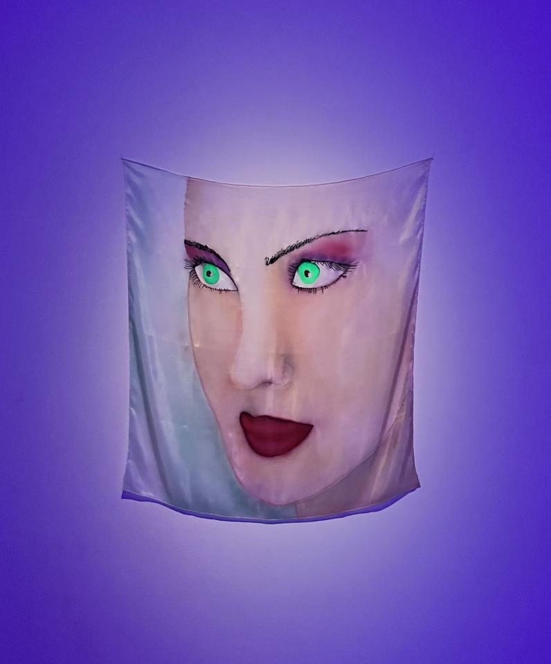 Angelina, 2023, peinture sur soie, 90 x 90 cm, vue de l’exposition FLUO PARTY : art, mode, musique, 2023, La Fabrique, Toulouse, photo Jérôme Carrié