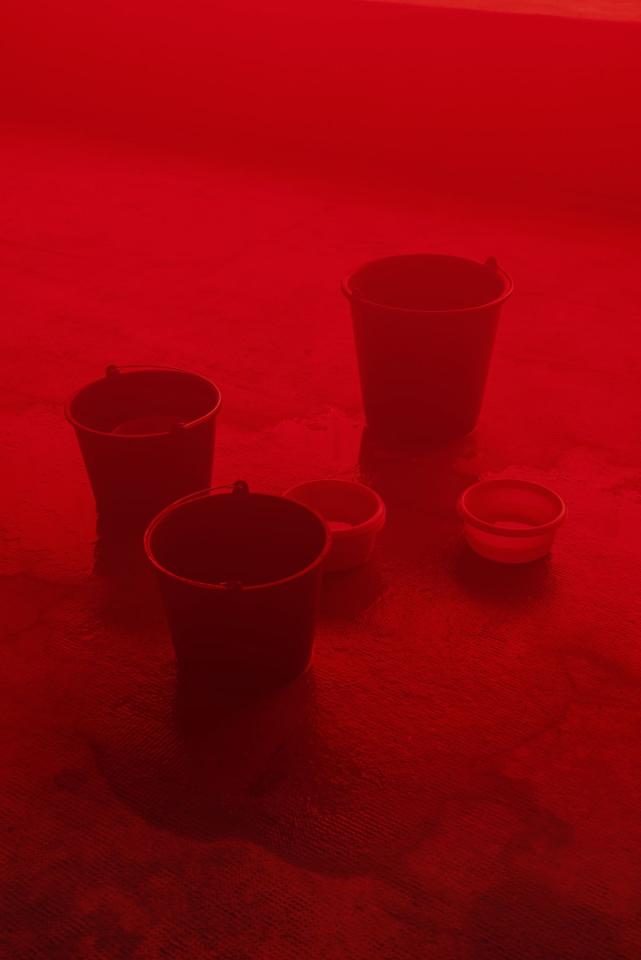 Néons, gélatines, porte pvc, radiateur, modules en ragréage, seaux, serviettes