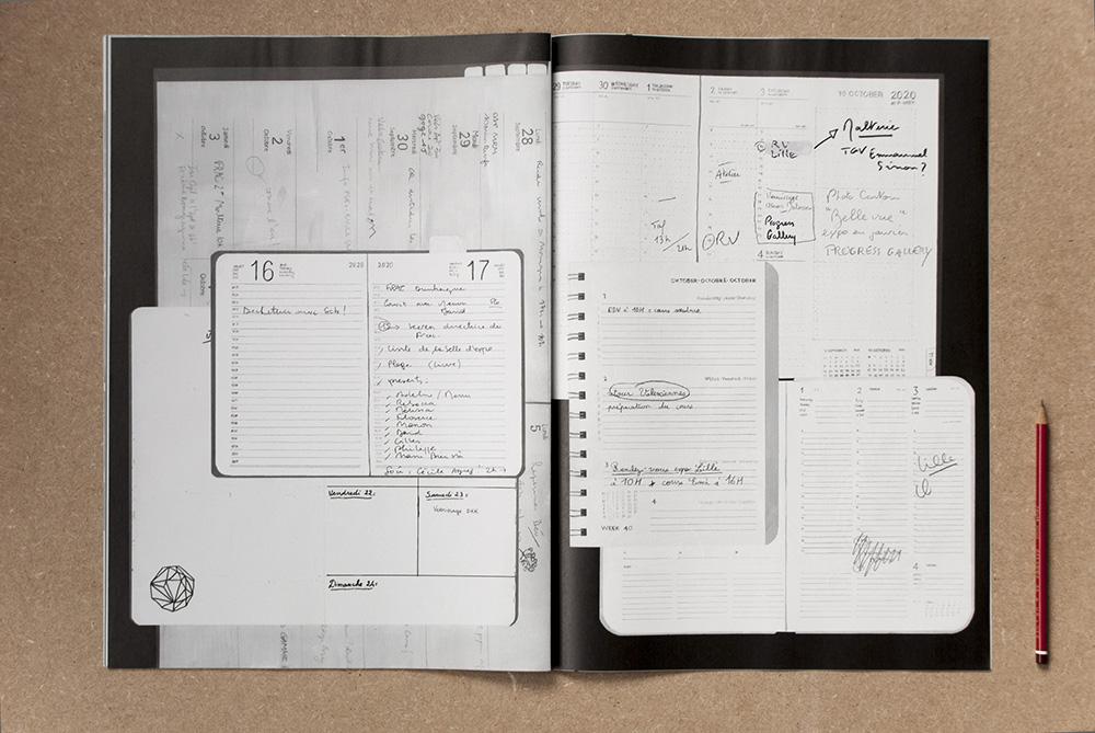 Agenda moyen, 2021, édition, 390 pages, 19,5 × 13,9 cm, duo Fo[…]nd Vo[…]x (Julie Saclier & Benoît Sanfourche), conception graphique Ninon Lemonnier, production Trois‿a, photo Ninon Lemonnier