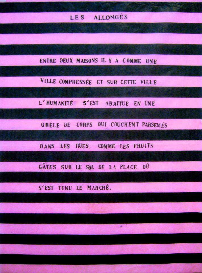 Ce travail est le résultat d’une résidence dans une ville qui ne se prête pas à la balade photographique et où le matériel audiovisuel expose au vol la personne seule qui le porte. Le texte intervient alors face à une impossibilité de faire des images et se substitue à leur absence. Chaque texte, qui à partir d’une même phrase de départ opère un zoom dans une ville que je découvre, est tamponné sur du papier trouvé sur place : papier journal vierge, papier aux couleurs portant des noms de villes, d’îles ou de déserts, papier de soie aux imprimés de couleurs vives pour la fabrication de cerfs-volants…
