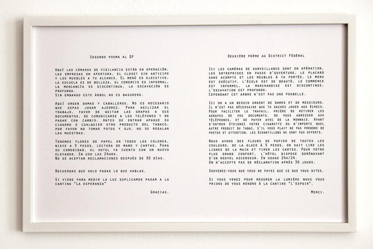 Hecho en México résulte aussi d’un travail de rencontre, de découpe et de déroute. L’artiste rêve une sociologie pour restituer un nouveau langage qui mixe traduction littérale et interprétation. A partir de la collecte de mots écrits et d’annonces dans les rues et places de Mexico, elle met en tension et en lien des fragments plus ou moins aléatoires pour composer des textes, lettres ou poèmes, anonymes et collectifs. La superposition des langues, des filtres de lecture et la dé-contextualisation des mots créent un ensemble étrange. Se mêlent sans hiérarchie, réalité sociale et environnement sous contrôle, désillusion et espoir, absurdité et humanité, intimité et espace public, une densité à plusieurs visages à l’image de la mégapole surpeuplée.