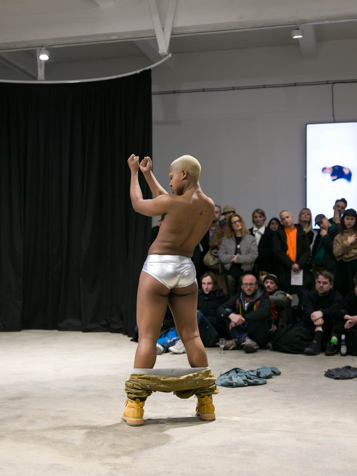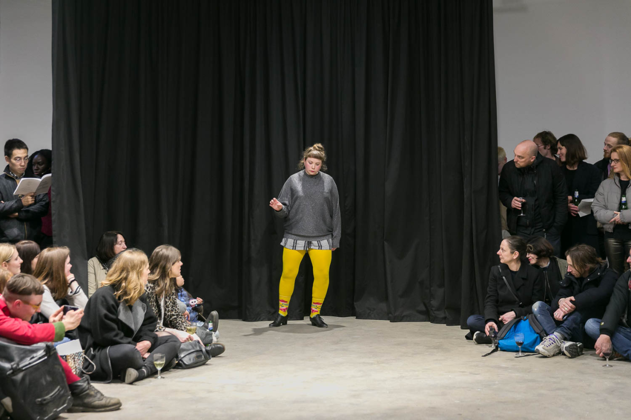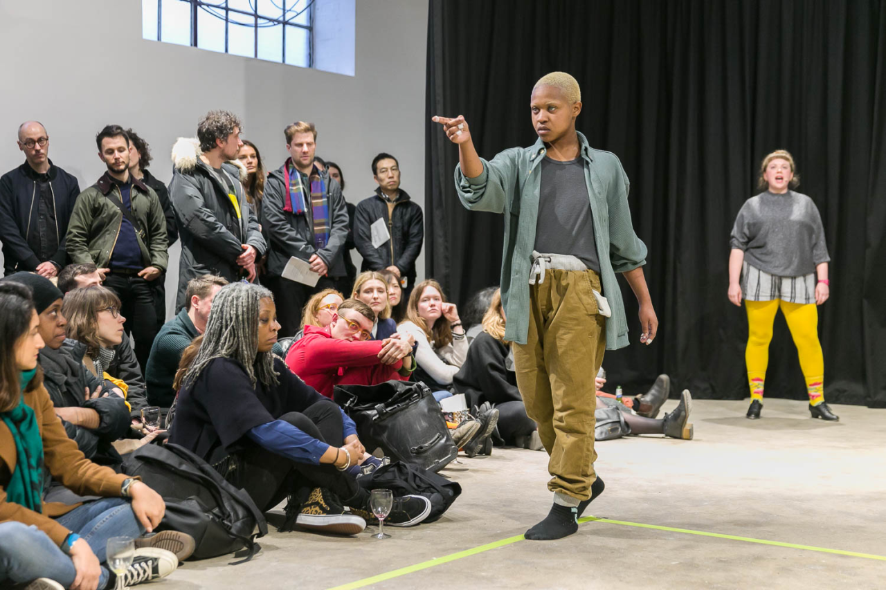 I took everything and made it my own (the ghost is an appropriationist), 2018, performance, pièce sonore Sophie Mallett, performeurs·ses Charlie Laban Trier, Loveday Smith et Sophia van der Putten, dans le cadre la performance en trois parties A fire circle for a public hearing, 45 min, Chisenhale Gallery, Londres, Royaume-Uni, photo Mark Blower