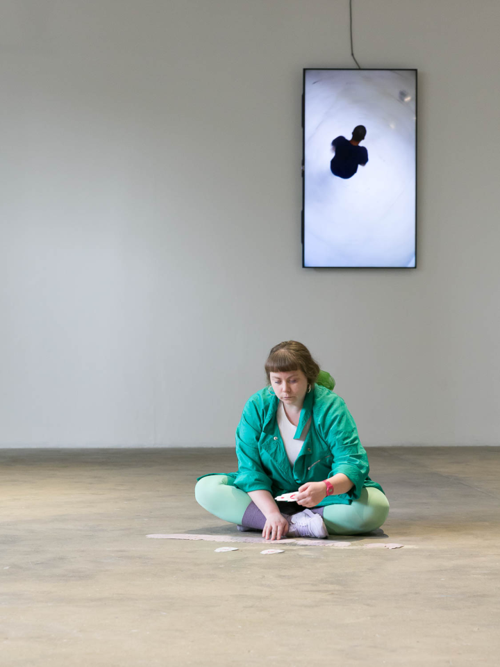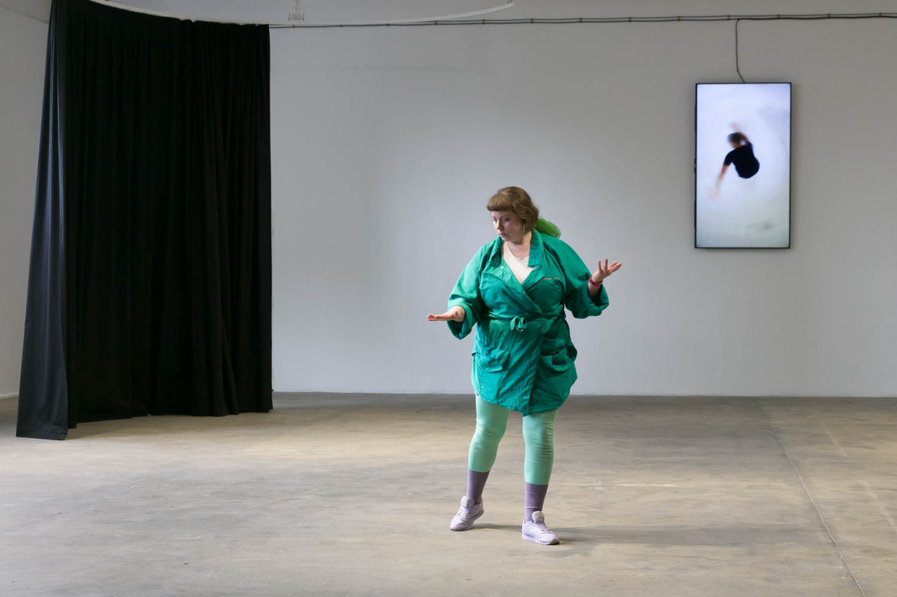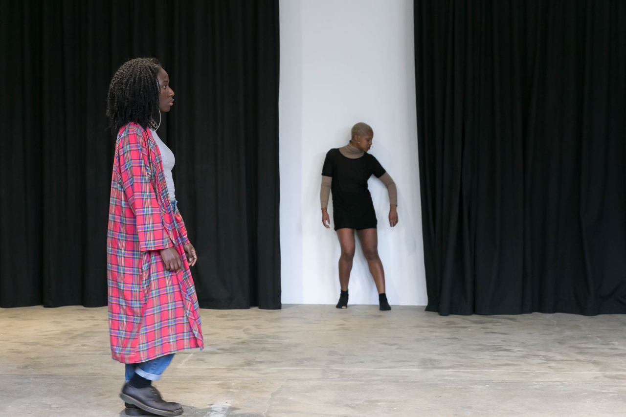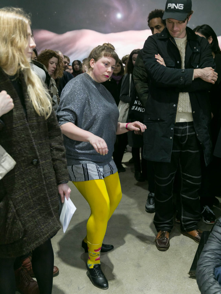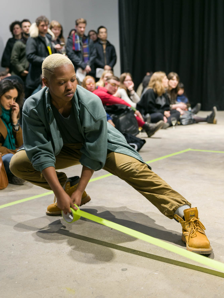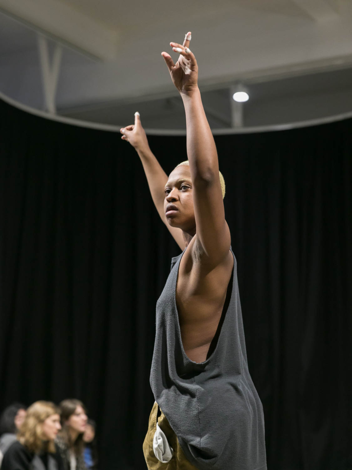 A place you only go through, 2018, performance, pièce sonore Sophie Mallett, performeurs·ses Charlie Laban Trier, Loveday Smith et Sophia van der Putten, dans le cadre la performance en trois parties A fire circle for a public hearing, 45 min, Chisenhale Gallery, Londres, Royaume-Uni, photo Mark Blower