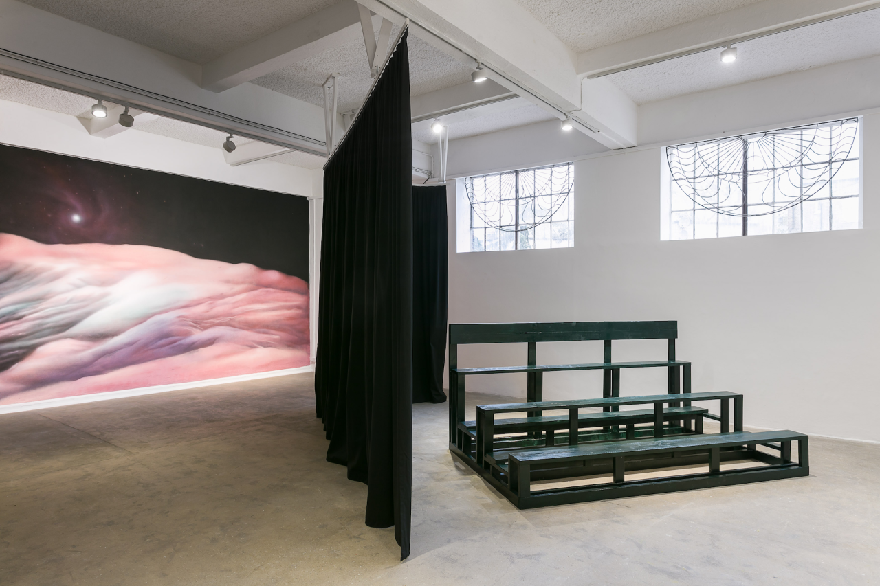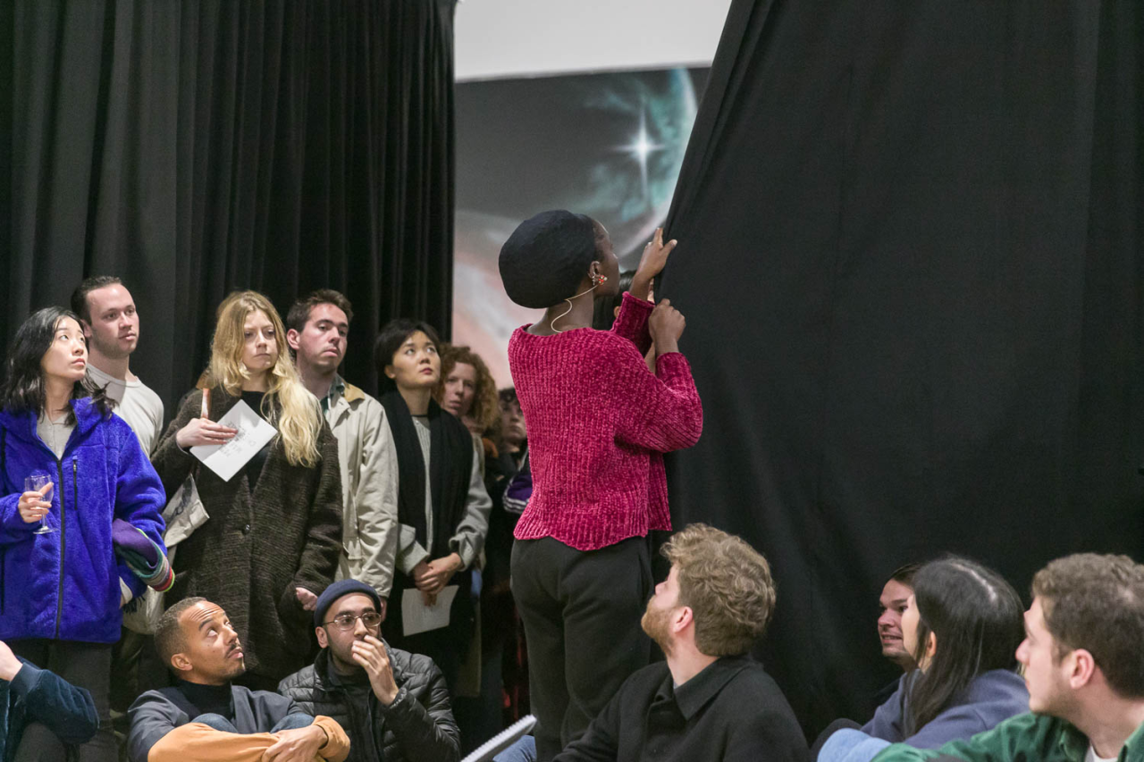 A fire circle for a public hearing cherche à étudier comment les actes de visibilité et d’invisibilité servent à remettre en question la présence et l’absence de récits marginalisés dans les histoires prédominantes, en invitant les visiteurs à affirmer leur propre compréhension des passés ou des futurs possibles. En spéculant sur des mondes et des vies ailleurs, la nouvelle exposition de Maheke à la Chisenhale Gallery devient un site public pour réarticuler et réinventer des formes de relation et de représentation, autant qu’un outil pour développer un nouveau lexique pour penser les identités en dehors de la politique de l’identité.