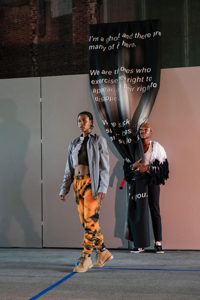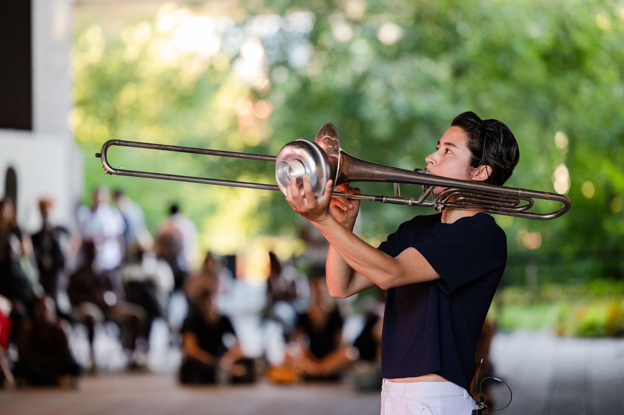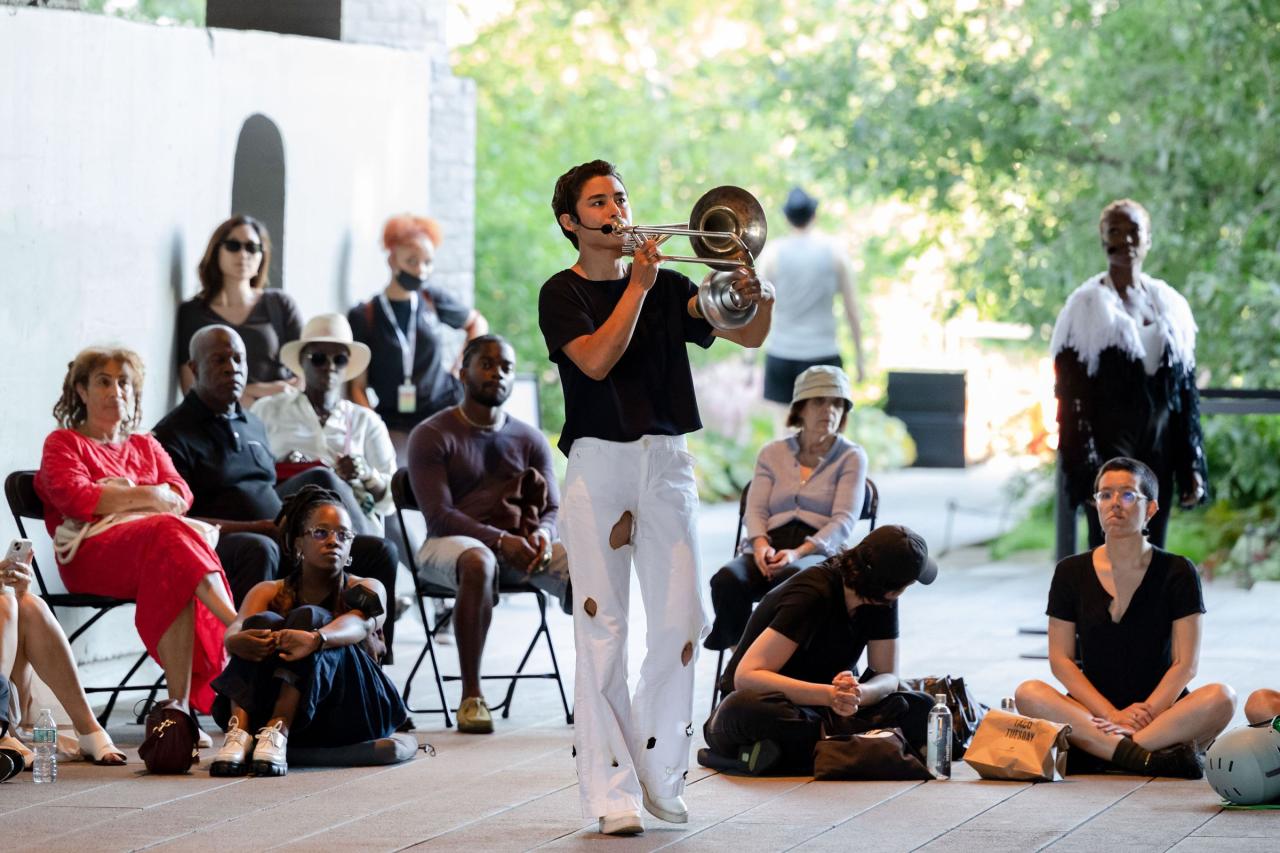 A fire circle for a public hearing témoigne de l’engagement permanent de Maheke à l’égard du potentiel du corps comme archive ; la performance aborde la manière dont l’histoire, la mémoire et l’identité sont formées. Dans cette œuvre, trois interprètes incarnent différents personnages comme s’ils étaient possédés par des entités fantomatiques. Leurs mouvements et leur dialogue explorent l’hypervisibilité et l’effacement tels qu’ils se manifestent dans la marginalisation historique et les mouvements politiques contemporains. Sur la High Line, Maheke présente cette performance captivante pour la première fois aux États-Unis.
