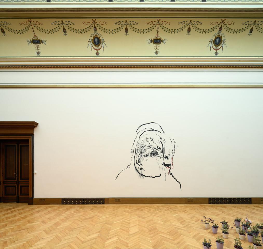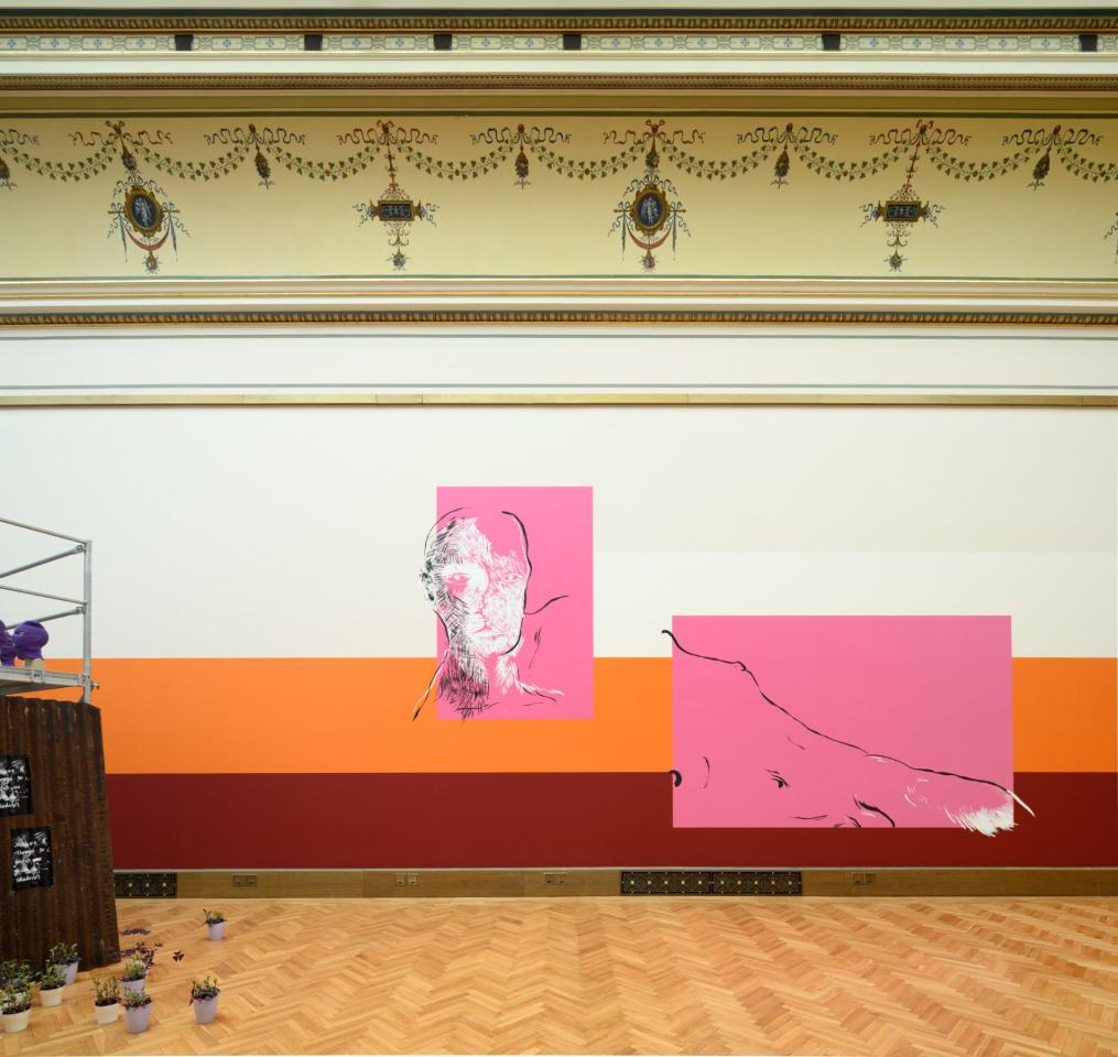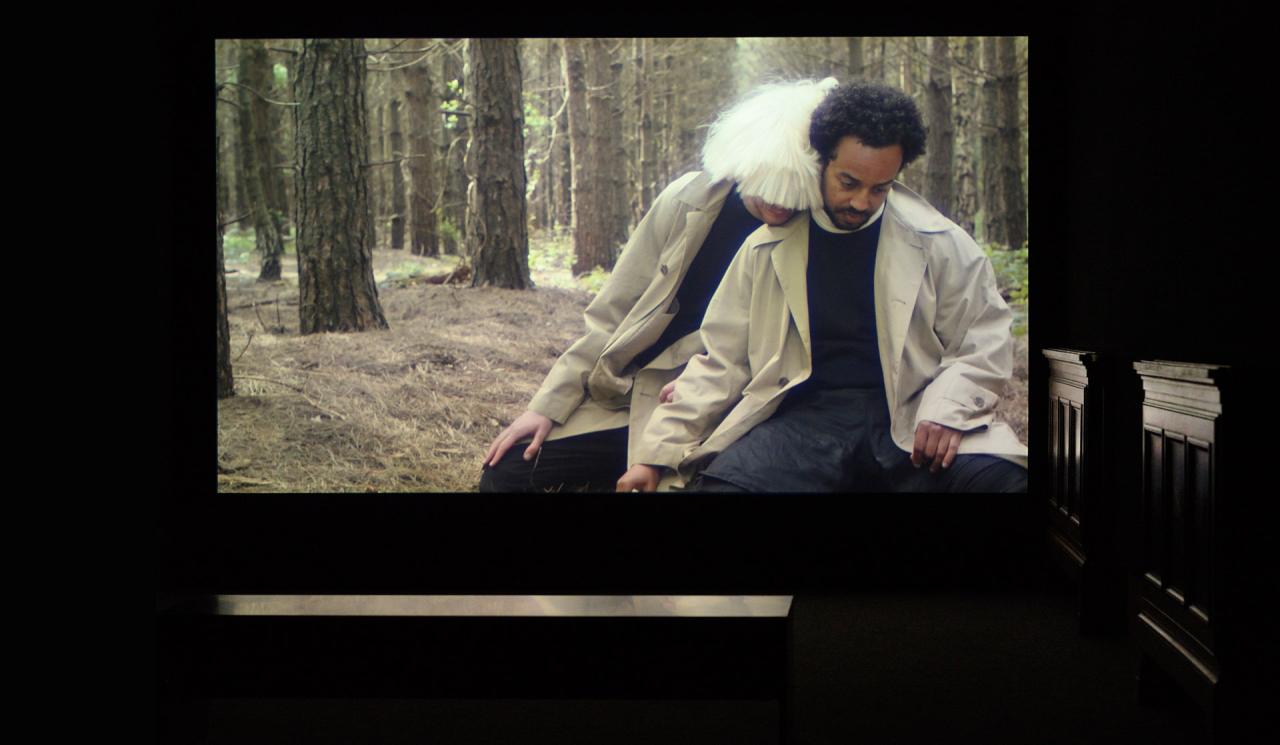 Ici, dans l’exposition Shifted Realities, je présente deux œuvres et une installation qui réunit des peintures murales, différents objets, des objets trouvés en réalité, comme des objets récupérés, ainsi que des gravures, des lumières et un film d’une durée de vingt minutes, intitulé Mauve, Jim and John. Le projet dans son ensemble s’intitule You & I. Ce titre est emprunté à une chanson inédite de Jeff Buckley. Il s’agit donc d’un titre très simple, qui revêtit beaucoup de dimensions et de profondeur, car pour moi, les deux œuvres sont étroitement liées parce qu’elles abordent de d’une certaine manière les thèmes de l’interconnexion et des interrelations ou de l’interdépendance. L’idée sous-jacente est donc d’étudier quelle est cette relation entre toi et moi, qui est toi et qui est moi, et la possibilité d’un « nous par ailleurs ».