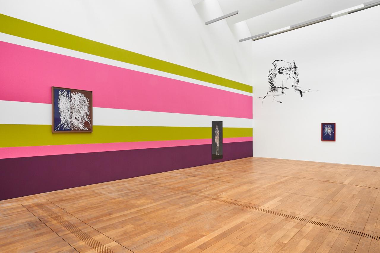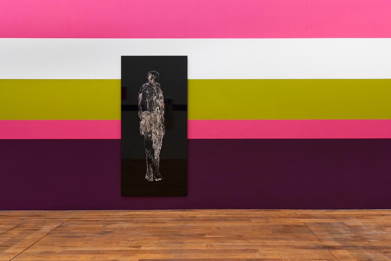 The Purple Chamber Series (Standing figure), 2024, peinture murale, vue de l’exposition To Be Blindly Hopeful, 2024, Mostyn, Llandudno, Royaume-Uni, détail, photo Rob Battersby