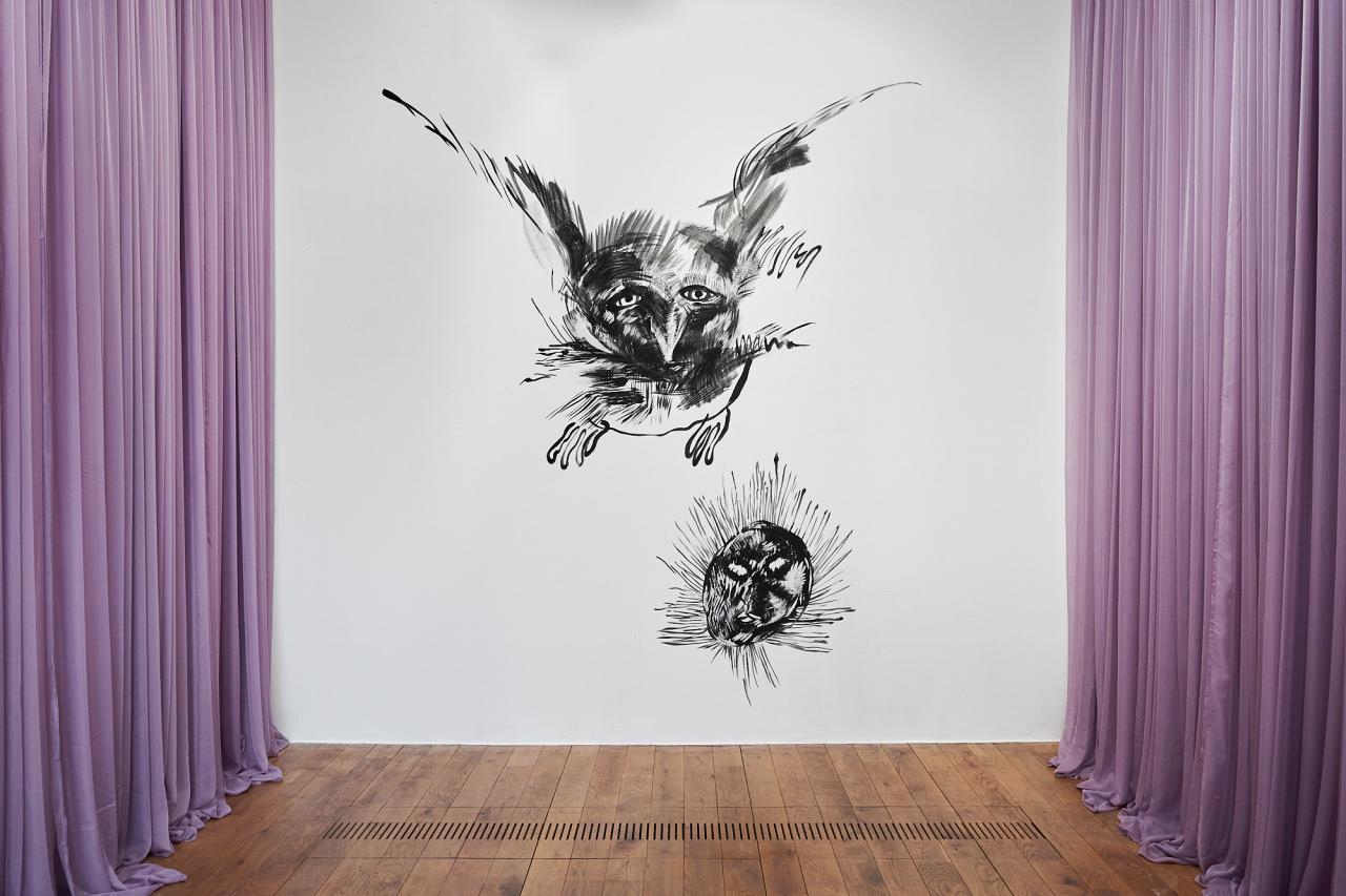 The Purple Chamber Series (Owl), 2023 peinture murale, rideaux en soie, vue de l’exposition To Be Blindly Hopeful, 2024, Mostyn, Llandudno, Royaume-Uni, détail, photo Rob Battersby