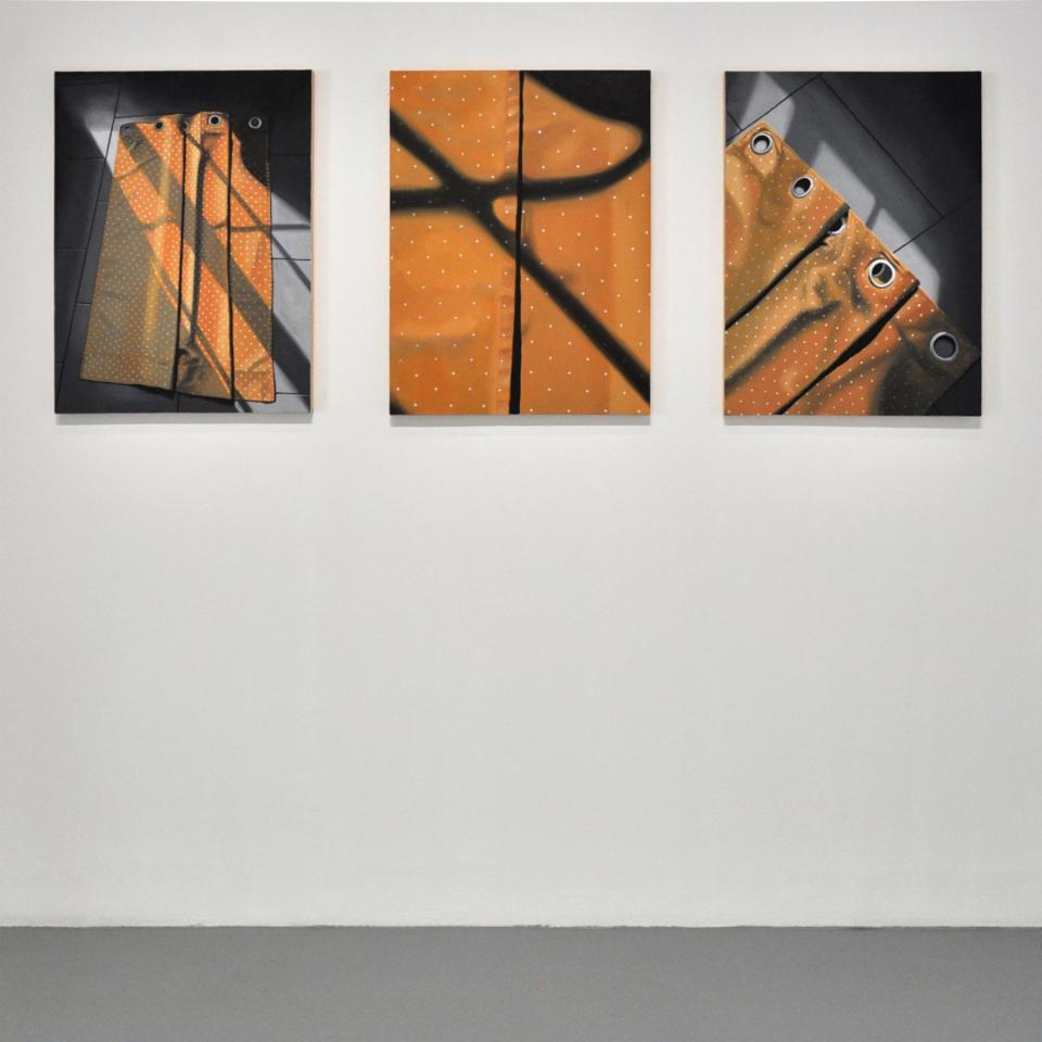 Rideau (idéal chambre d’enfant), 2022, huile sur toile, triptique, 75 x 50 cm chacune, vue de l’exposition personnelle Comme si…, 2022, Galerie Aperto, Montpellier